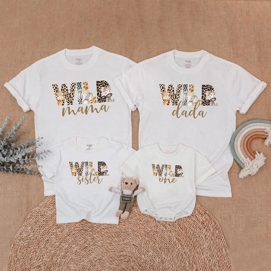 Wild Safari Animal Print Birthday Family Shirts Mommy Dada Sister One Matching Outfits Zoo Celebration Clothes Cute Giraffe Elephant Zebra Floral Headpiece