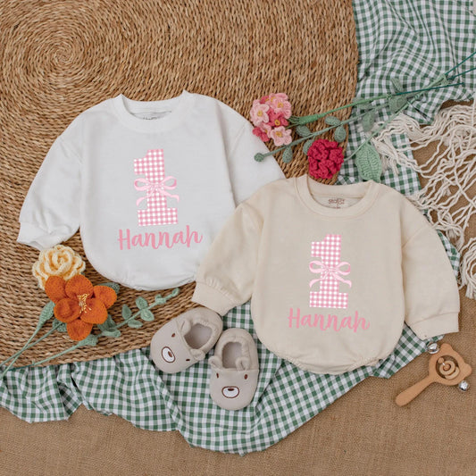 Pink Bow First Birthday Romper Baby Girl Outfit Checkered Bodysuit Girly Party Gift Custom 1st Birthday Clothes