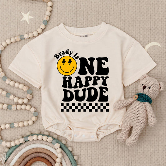 Custom Name One Cool Dude Birthday Romper Smiley Face & Checker Design 1st Birthday Boy Baby Bodysuit Party Outfit