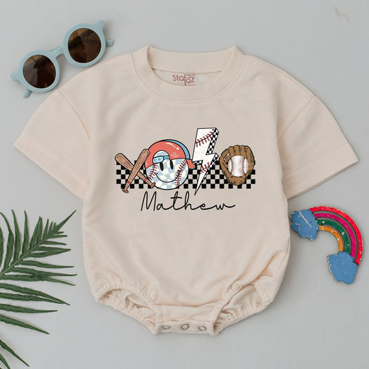 Personalized Game Day Baseball Romper Retro Baby Outfit Custom Name Number Little Slugger Short Sleeve Bubble Boy Clothes Gameday Season Newborn Gift