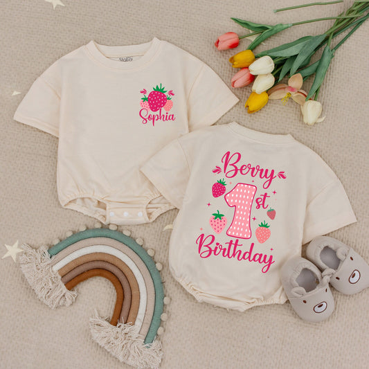 Personalized Strawberry Baby Girl First Birthday Bubble Romper Cute Berry 1st Birthday Bodysuit Soft Cotton Celebration Outfit
