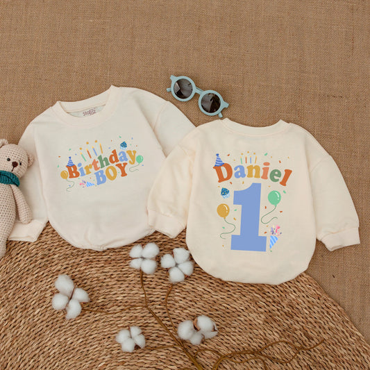 Personalized First Birthday Boy Romper Daniel's Name Bright Blue Orange Cake Smash Outfit with Confetti Candles Balloons Party Hat Design