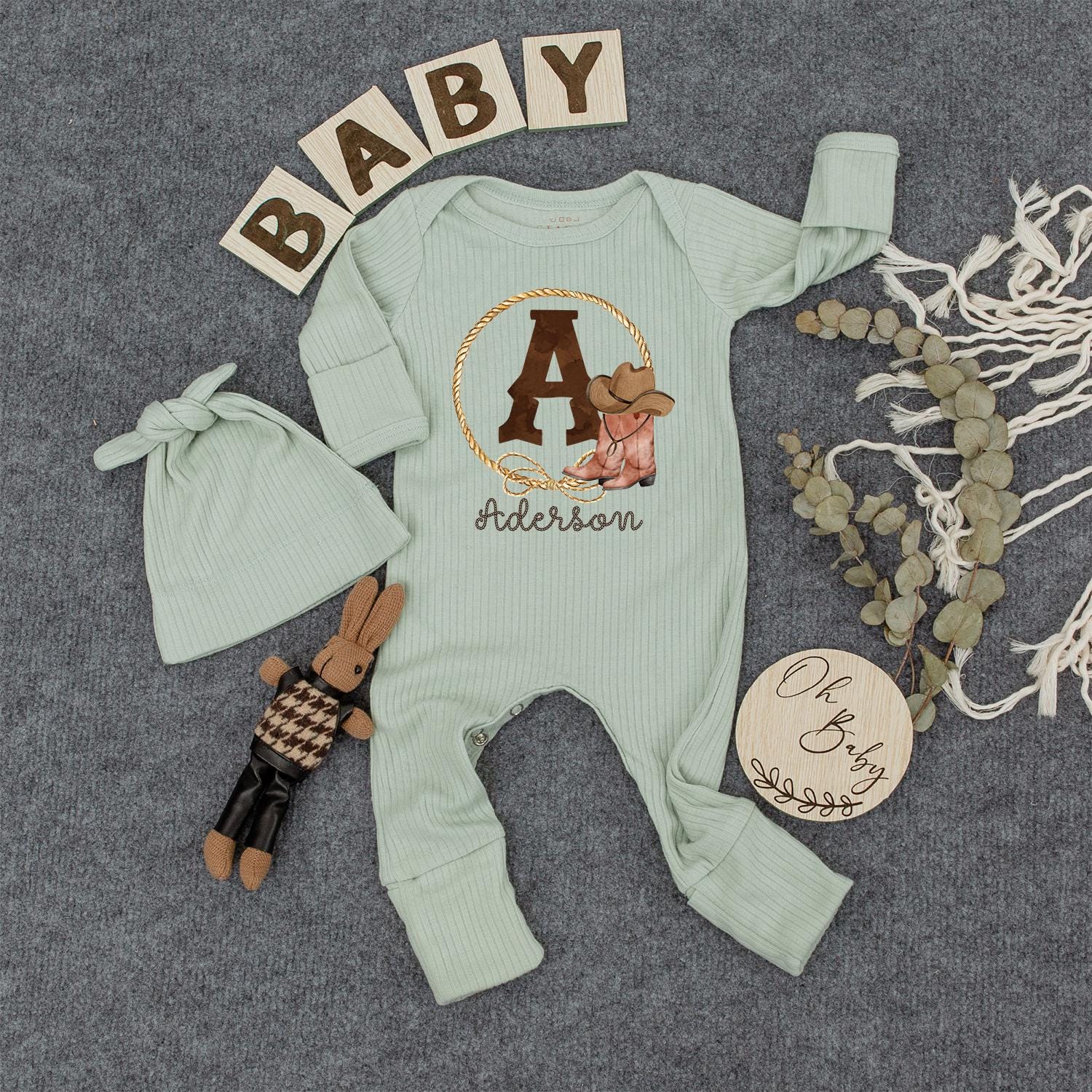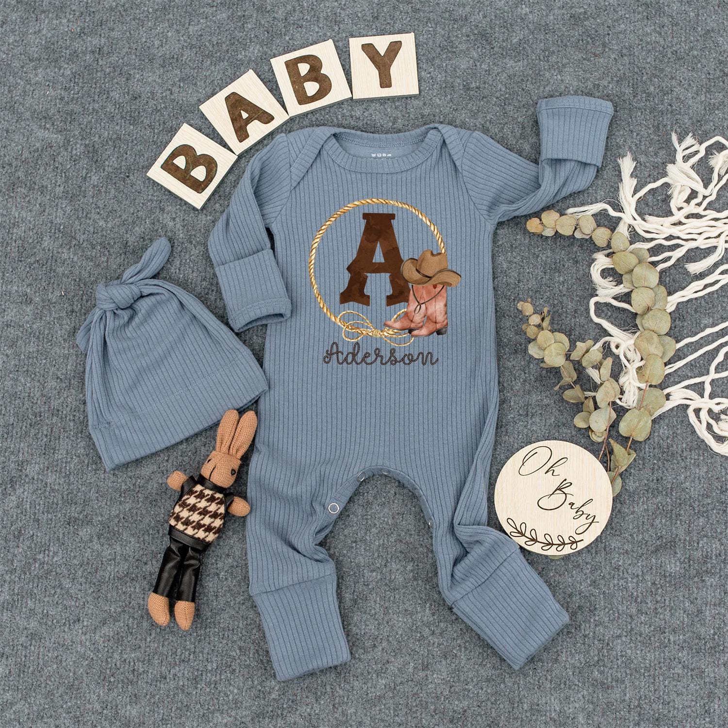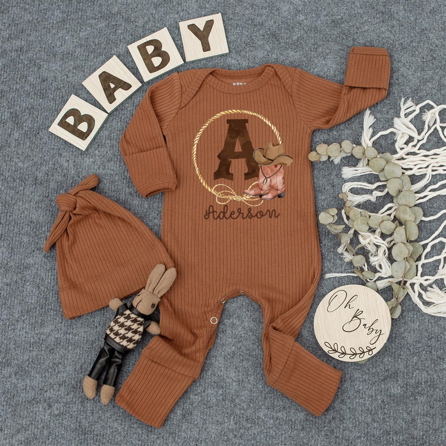 Aderson Western Cowboy Baby Romper with Initial A Golden Rope Lasso Boots Hat Long Sleeve Ribbed Newborn Outfit Gift Idea Rustic Personalized