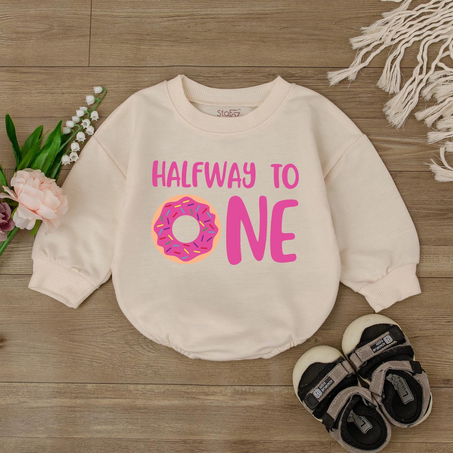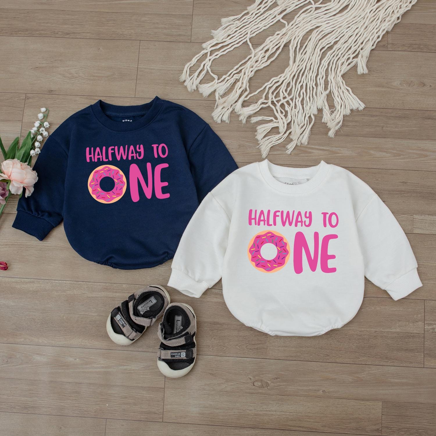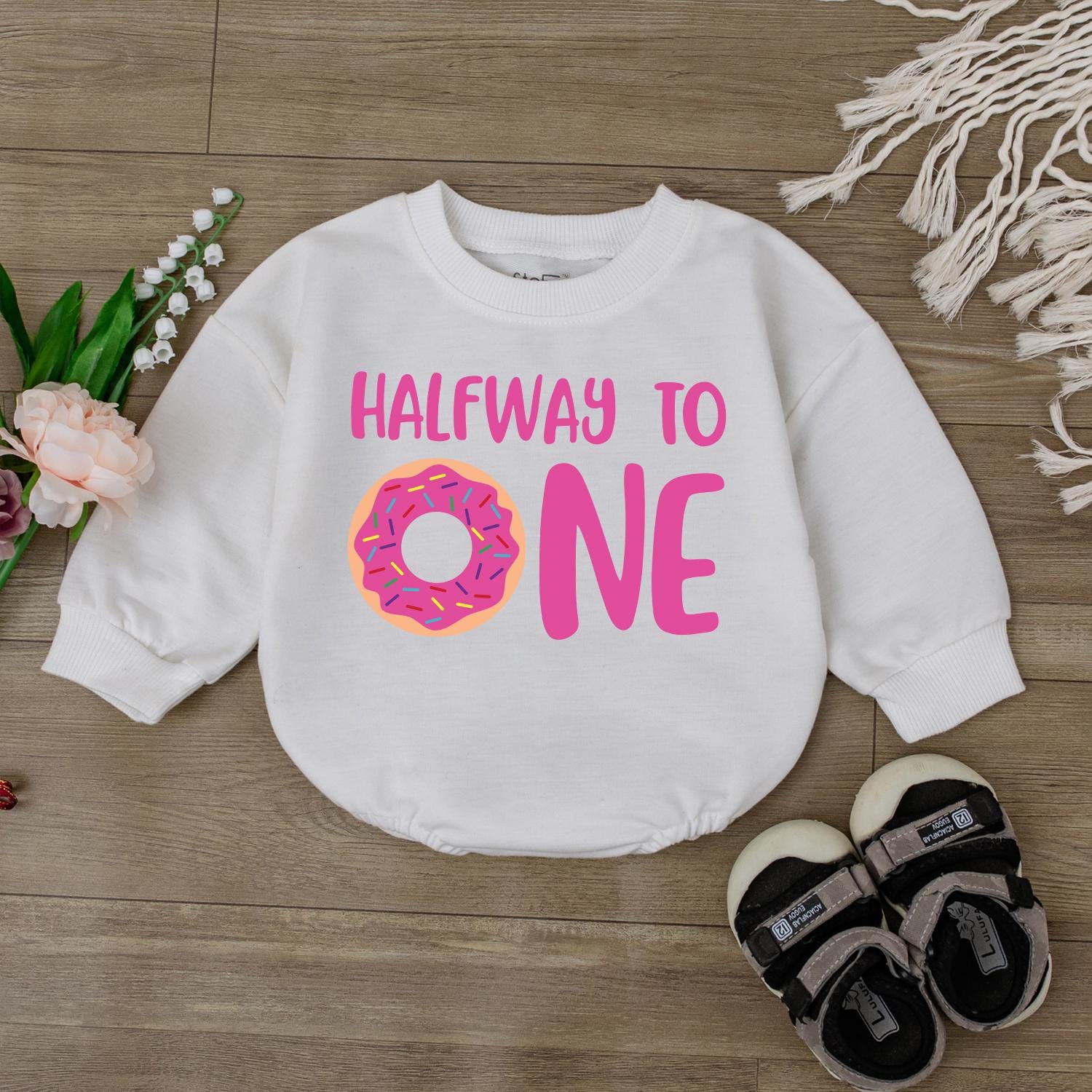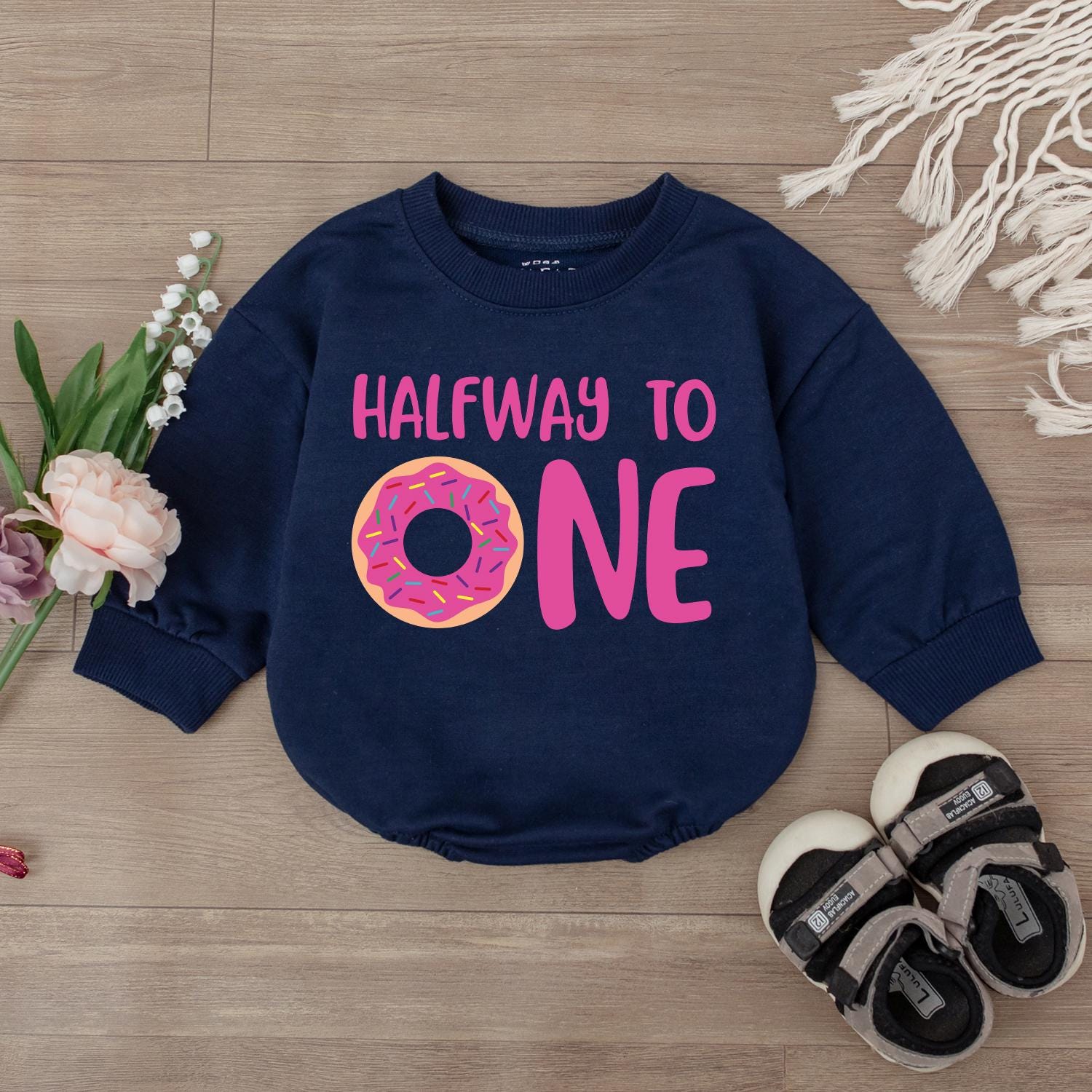 Celebrate those precious milestones with our "Half Way To One" Donut Birthday Romper! Imagine your little one looking absolutely darling, just a sprinkle away from their first birthday, dressed in this sweet donut-themed outfit. Crafted from soft, breathable cotton, this bodysuit is designed for ultimate comfort as your baby explores and plays. It’s the perfect way to capture those adorable half-birthday photos that you’ll cherish forever. Whether it’s for a cozy family gathering or a special photo shoot, this romper brings a touch of playful charm to any celebration. Makes a truly delightful gift for new parents, sure to bring smiles and happy memories.