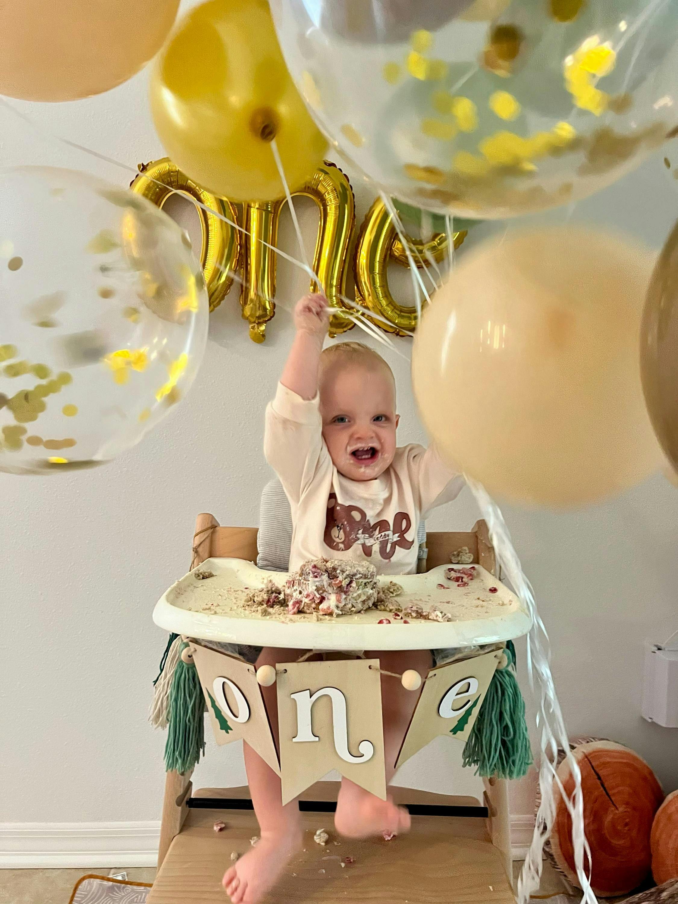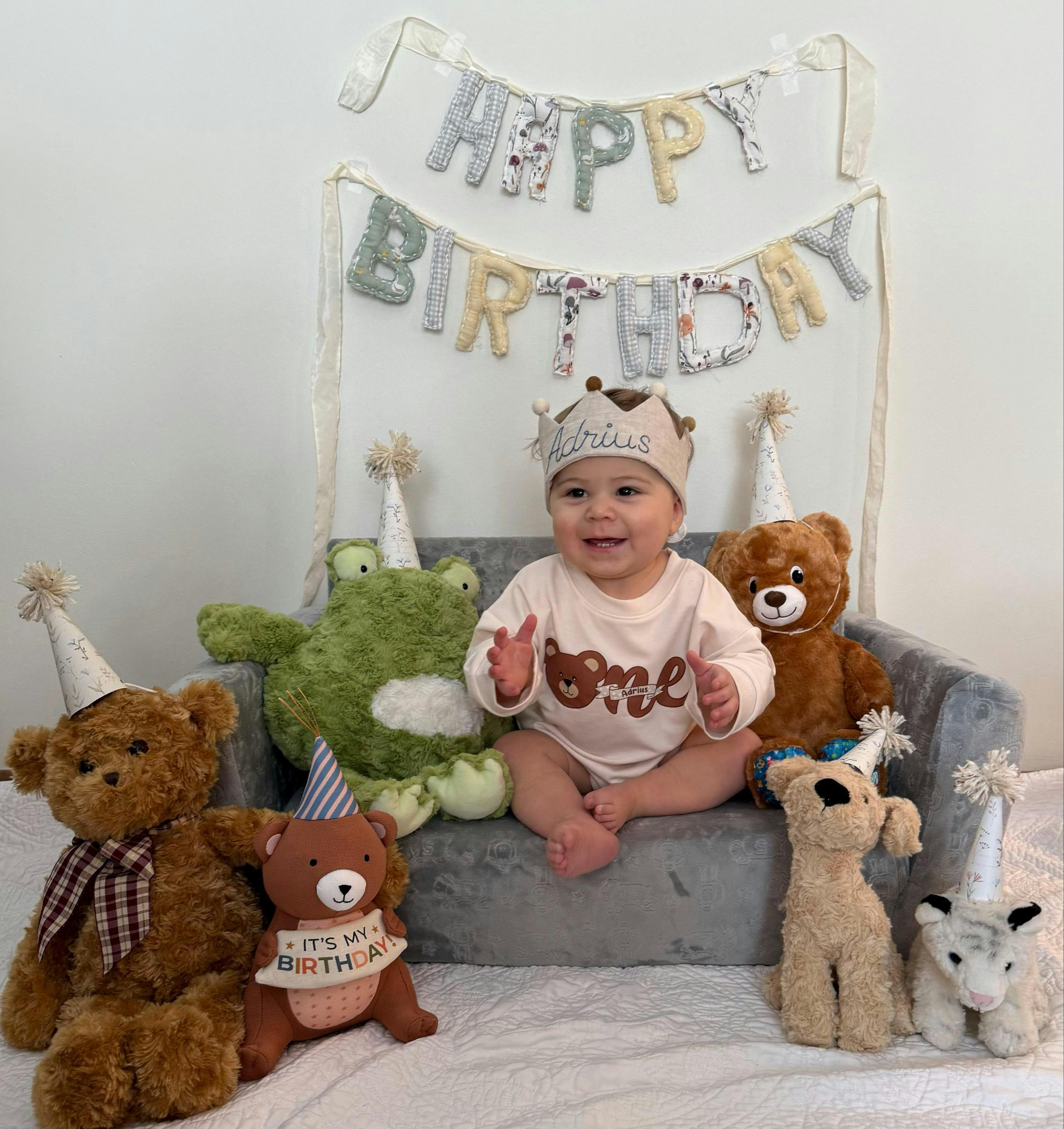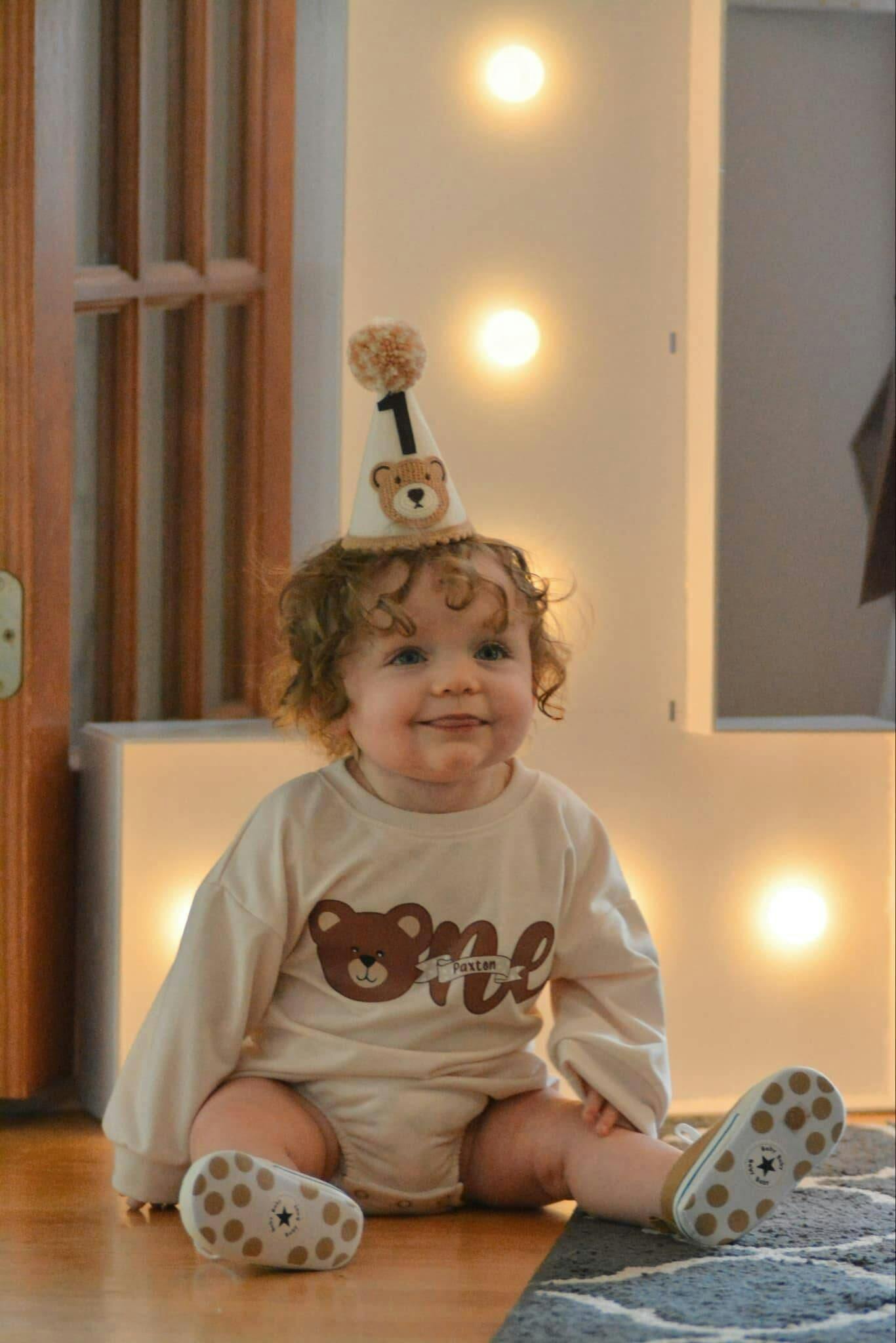 Celebrate that precious first birthday milestone with our absolutely adorable "Teddi" bear romper, crafted to make their special day even sweeter. This charming design features the word "one" in a playful cursive font, where the 'o' is replaced by a cute brown teddy bear head. A beige banner with the name "Teddi" in brown, adorned with tiny white polka dots, stretches across the middle, adding to its delightful appeal. Perfect for those unforgettable smash cake photos, a fun summer birthday party, or just a truly special family gathering. This outfit captures the joy and sweetness of their first year, creating cherished memories. Make your little one's big day beautifully memorable with this charming and comfortable keepsake.