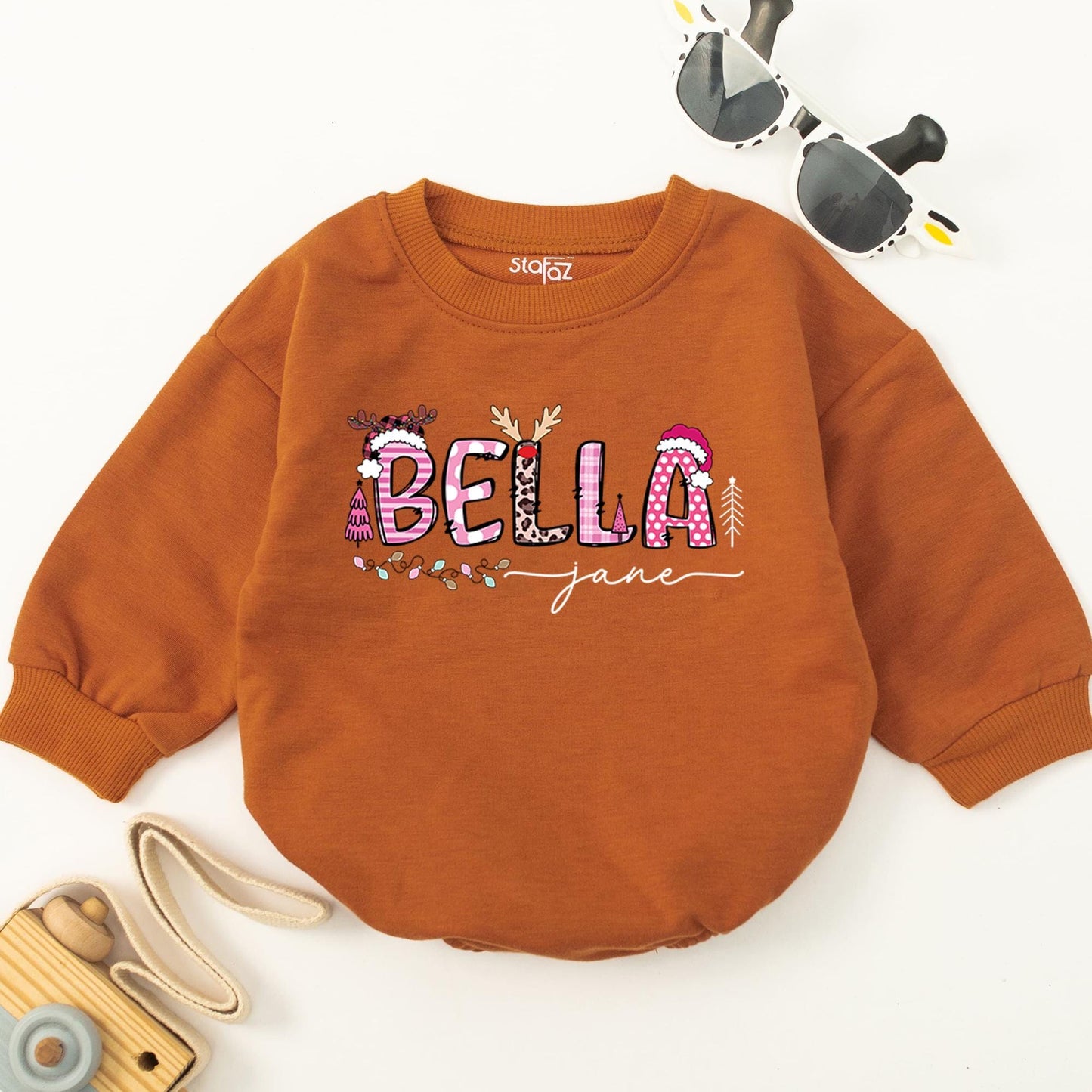 Celebrate your baby's first Christmas with a personalized bubble romper, perfect for the holiday season. This oversized, gender-neutral outfit is ideal for baby showers, coming home, or as a unique Christmas gift. Soft and comfy, it's a joyful and special way to treasure their first Xmas memories.