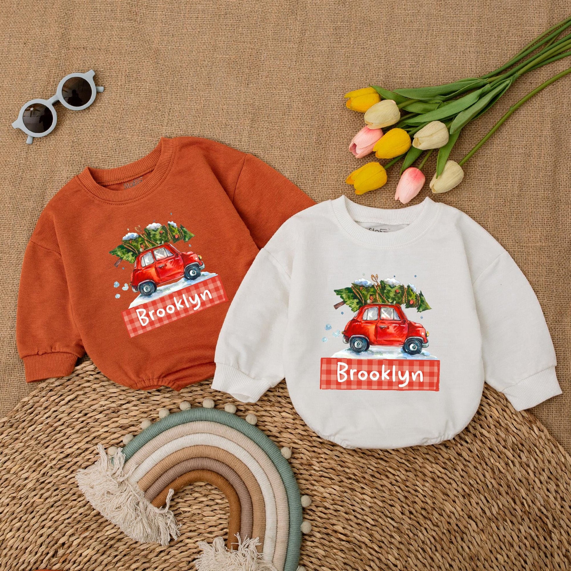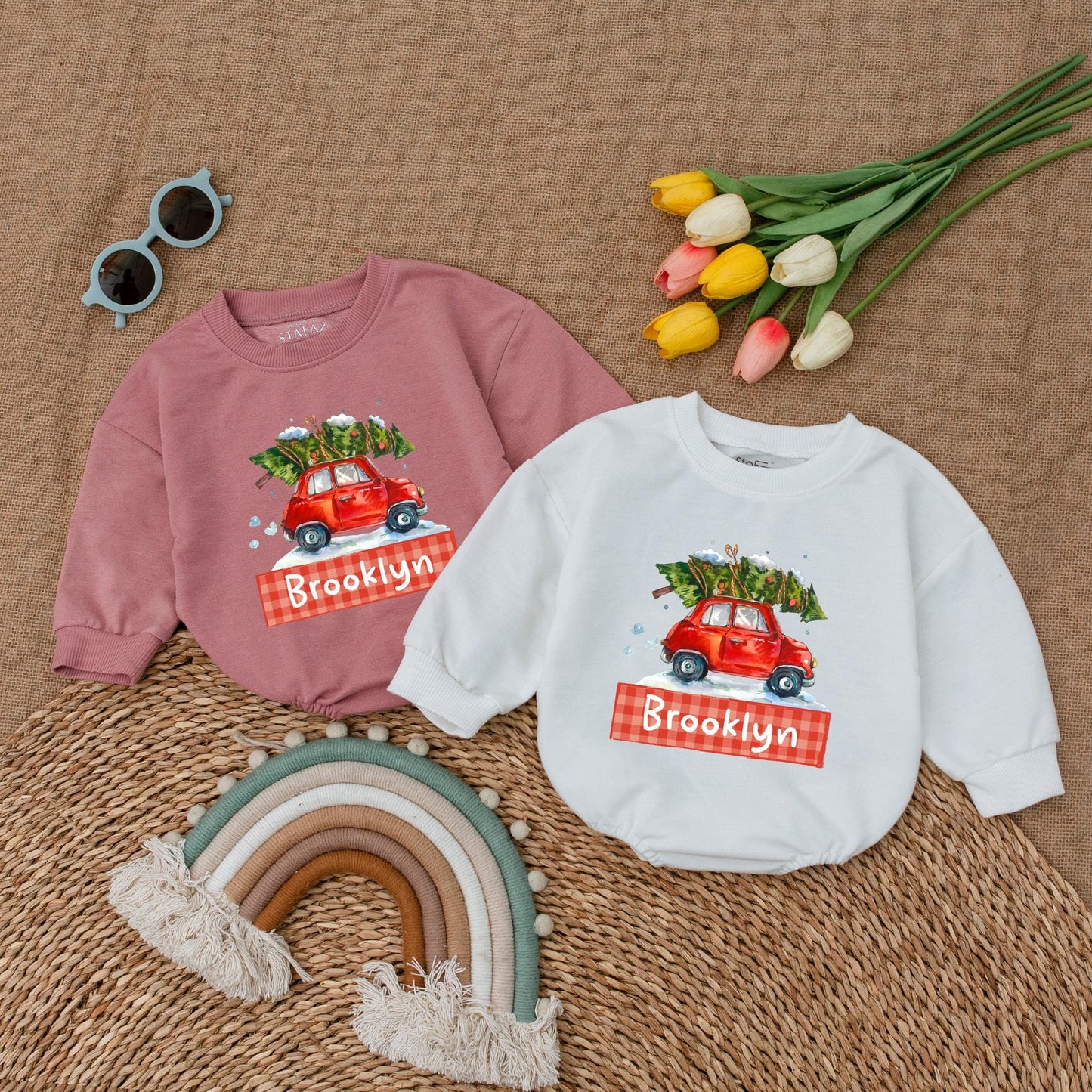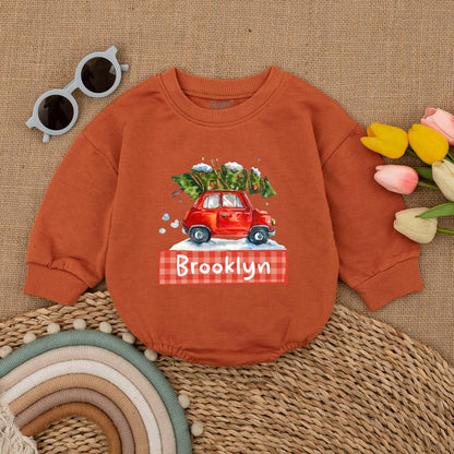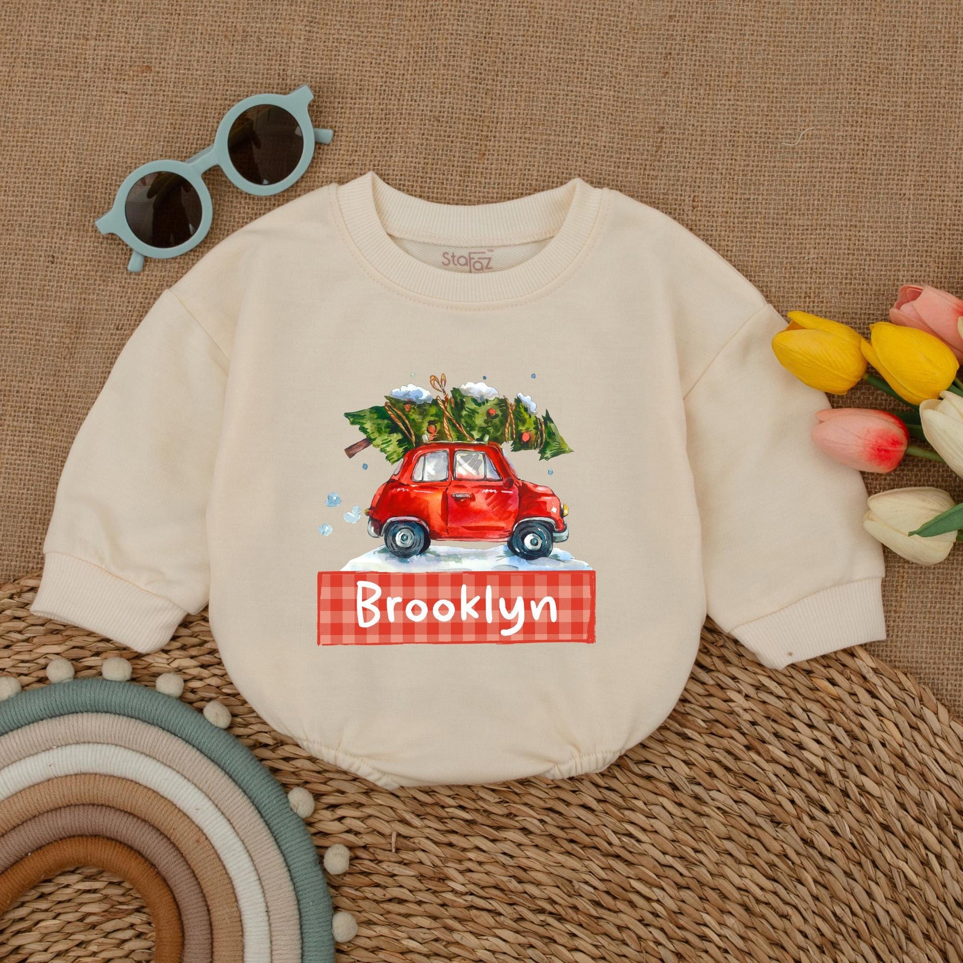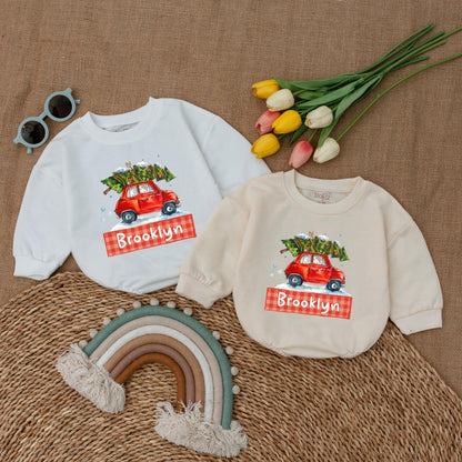 Celebrate your little one's first Christmas with this personalized car romper! Perfect for baby showers, this cozy bodysuit is an ideal gift. Made for winter comfort, it features playful retro designs for nostalgic flair. Make your baby's holiday memorable with this adorable, unique outfit.