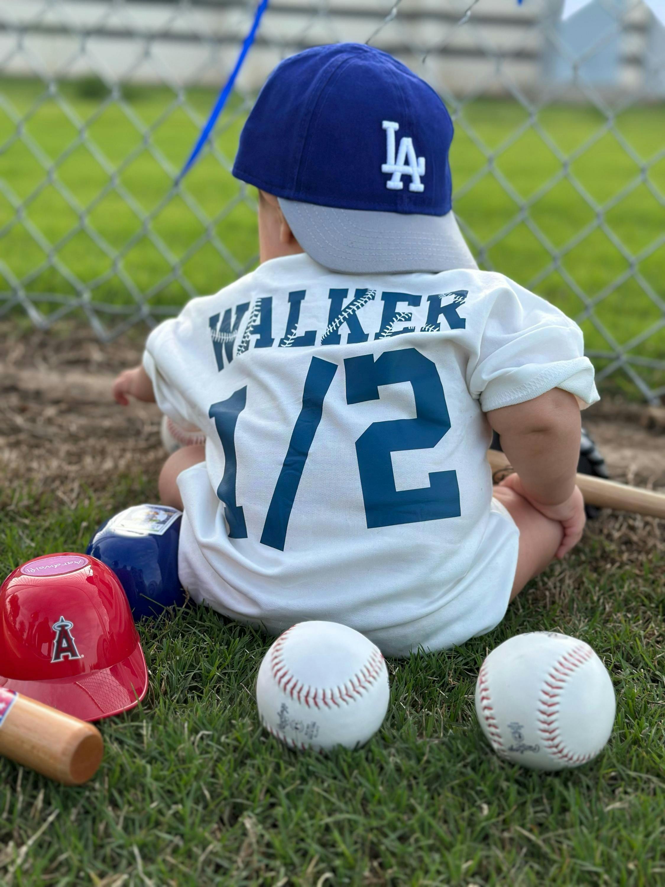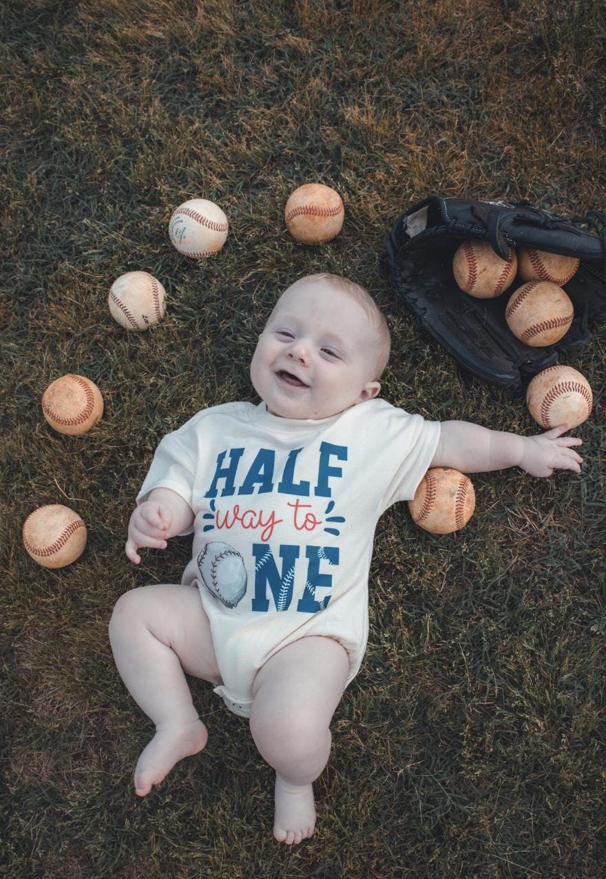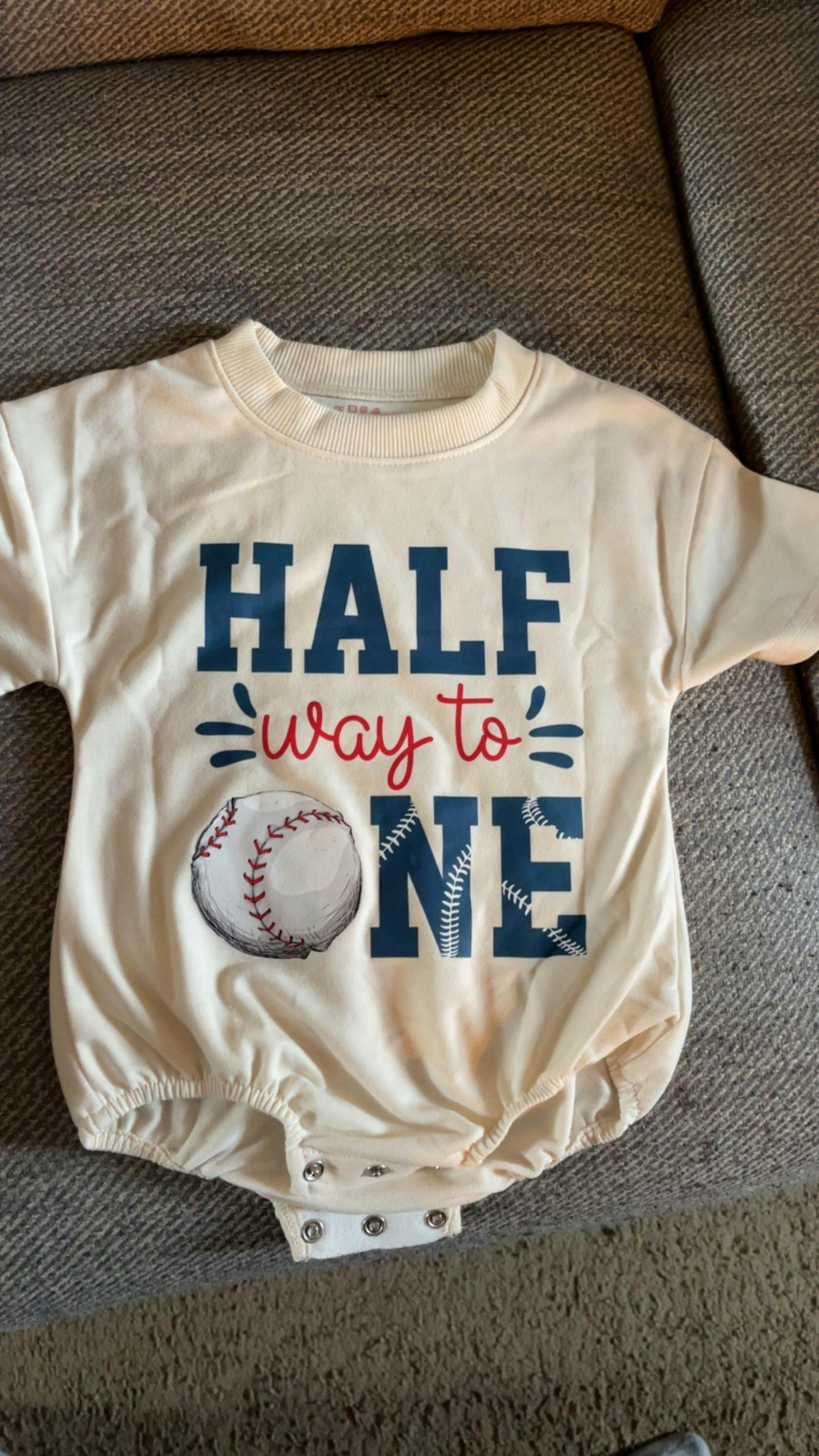 Celebrate your little slugger's special milestone with this adorable baseball-themed romper, perfect for their half birthday! This charming outfit features the playful phrase "HALF way to ONE" in vibrant blue block letters, with "way to" in a fun red cursive style, and a classic baseball graphic replacing the 'O' complete with visible red stitching. You can even personalize it with your baby's name, like "CLOHAN," in matching blue block font, making it truly one-of-a-kind. Ideal for capturing those precious six-month photos, a lively family gathering, or simply for everyday comfort, this sporty design is sure to bring smiles. It’s a wonderful way to mark their exciting journey to one year, creating cherished memories and a unique gift for your little one. Make this unforgettable milestone even more special with a personalized touch that’s as unique as they are.
