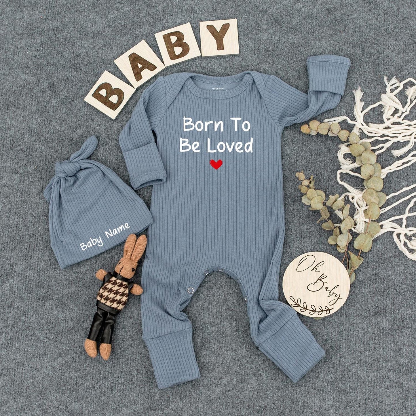 Born To Be Loved Personalized Baby Romper with Hat - Custom Name Newborn Outfit, Minimalist Gender Neutral Shower Gift Set - Sweet & Simple Baby Clothes