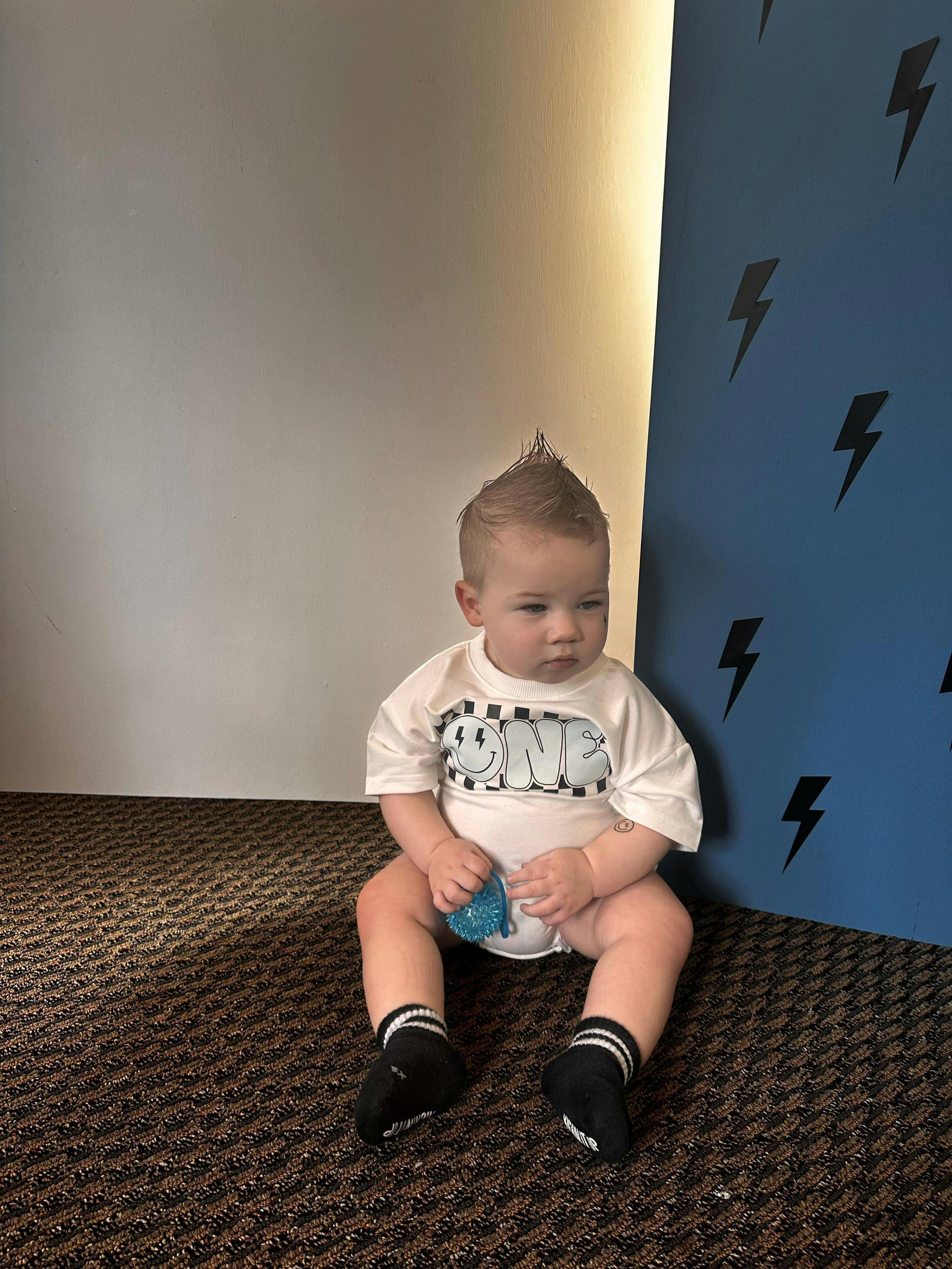 Celebrate your little guy's first birthday with this adorable "One Happy Dude" romper, perfect for making memories. The playful design features a cheerful smiley face with lightning bolt eyes and a cool checkerboard pattern, all in a vibrant blue hue. It's the ultimate outfit for a joyous cake smash or any special birthday celebration, creating picture-perfect moments to cherish. Imagine the smiles and laughter as your little one rocks this unique and stylish outfit on their big day. This romper isn't just clothing; it’s a keepsake designed to capture the pure delight of a milestone birthday. Also available for matching family moments, making your celebration even more cohesive and memorable. It makes a fantastic, personalized gift that parents and baby will adore.