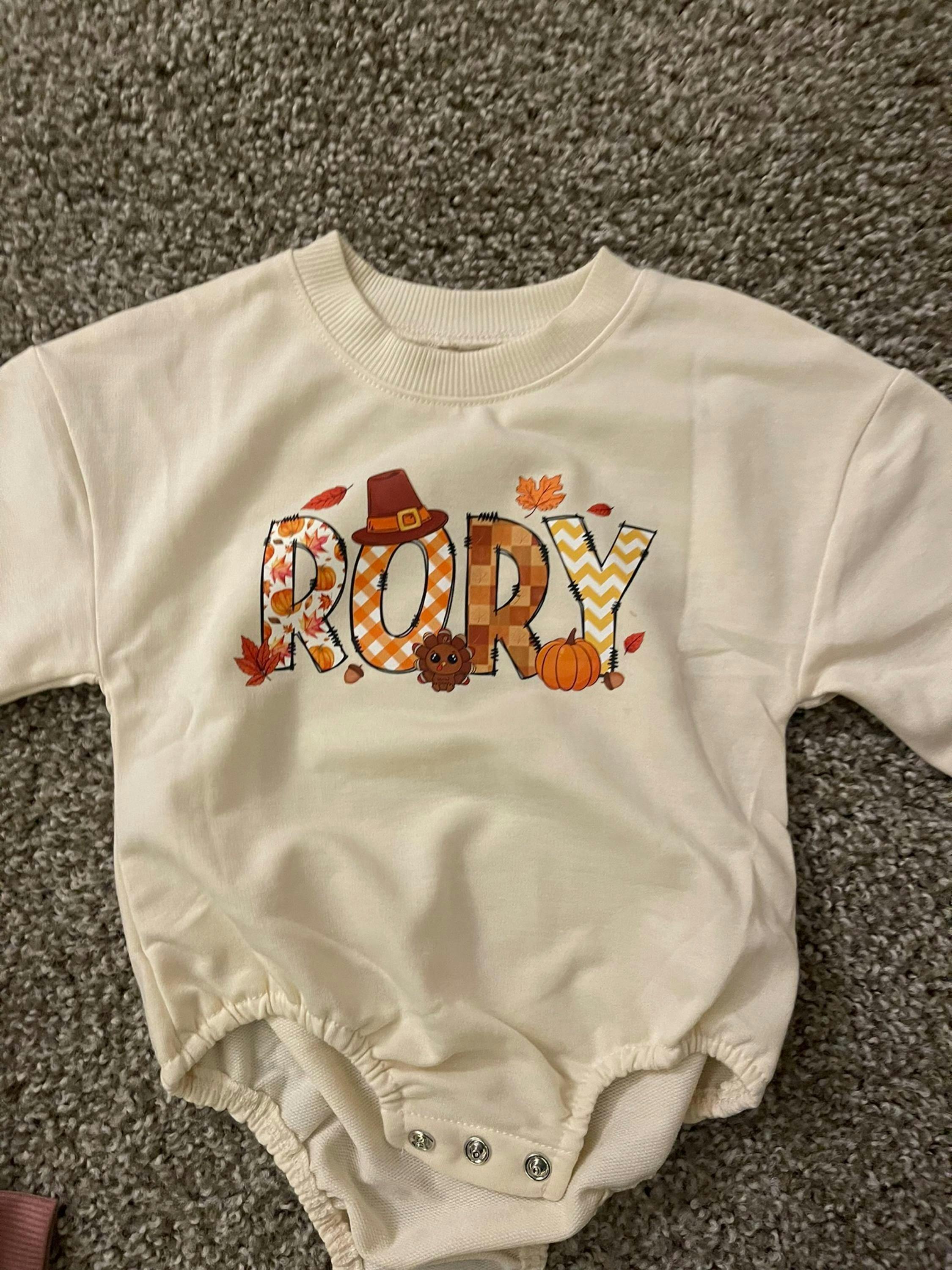 Capture the warmth of the season with this adorable Thanksgiving romper! Imagine your little one, dressed in this cute outfit, surrounded by pumpkins and leaves. The name "Garcia" is beautifully displayed, filled with festive autumn patterns, pilgrim hats, and tiny turkeys. Perfect for their first Thanksgiving or as a unique, personalized gift. This romper is more than just clothing; it's a keepsake for a lifetime of cherished memories. Let your little one celebrate Thanksgiving in style and comfort!