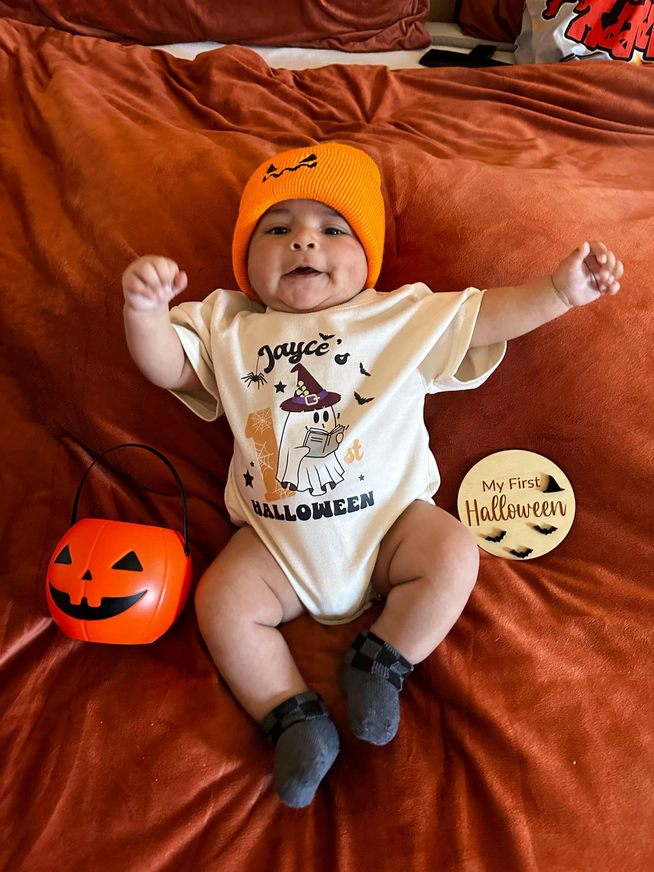 Celebrate your little one's very first Halloween with this absolutely adorable romper! Featuring a playful and friendly ghost sporting a witch's hat and engrossed in a good book, this outfit is pure autumn magic. A prominent '1' filled with a charming spiderweb pattern stands beside the ghost, perfectly capturing the 'My First Halloween' milestone. The bold 'William' scripted at the top and the 'Halloween' text at the bottom add a personal and festive touch, all wrapped in a sweet, retro vibe. This cute and cozy outfit is perfect for creating lasting memories during their special spooky season. Imagine capturing those precious first Halloween moments, where your little 'Little Boo' shines brightly in this custom creation. It’s more than just an outfit; it’s a keepsake from their inaugural Halloween adventure, designed to be cherished.