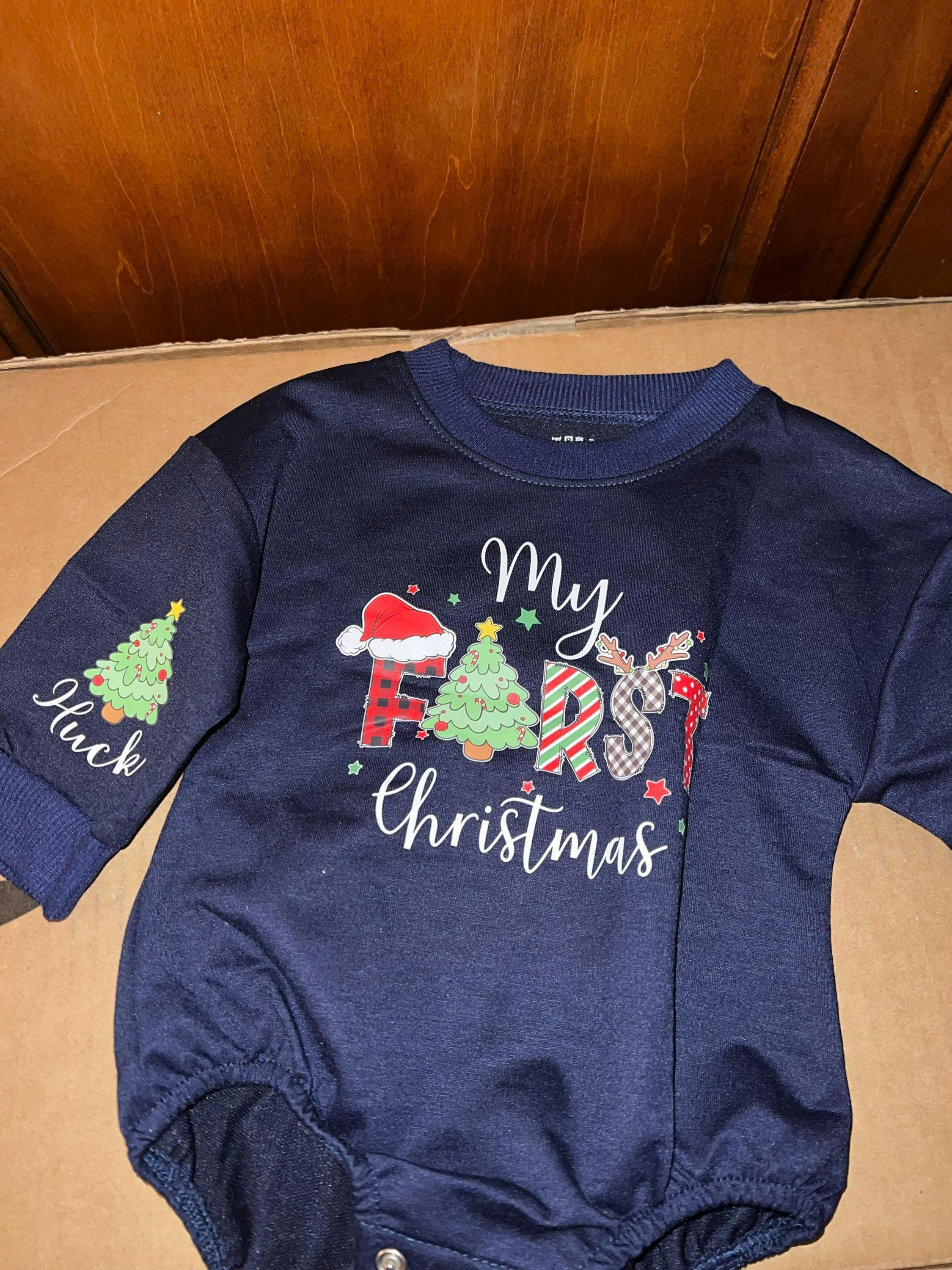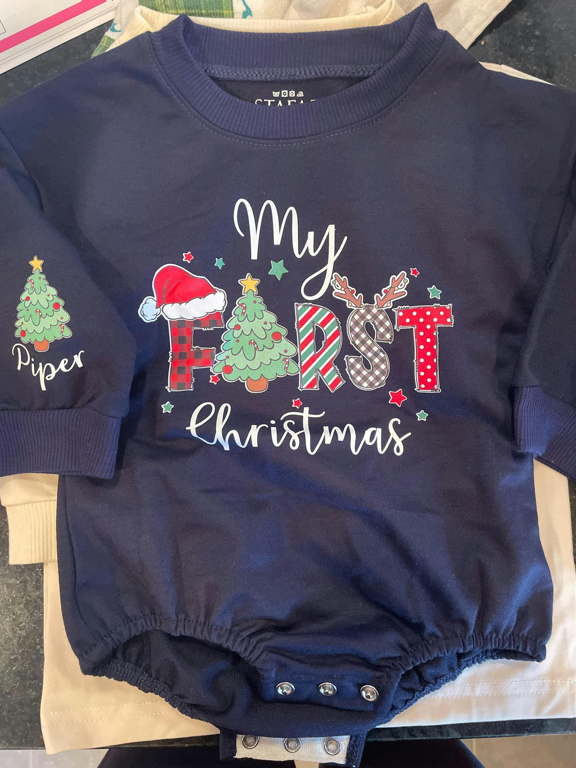 Imagine the joy of your baby's first Christmas morning! This adorable bodysuit captures that magic with its festive "My First Christmas" lettering. The whimsical design features a playful mix of buffalo check, polka dots, and stripes, all topped off with a Santa hat, reindeer antlers, and stars. Picture your little one snuggled up in this comfy outfit during holiday gatherings, creating cherished memories. Personalize it with their name to make it an extra special keepsake they'll treasure for years to come. This cheerful outfit is the perfect way to celebrate their first Christmas and makes a thoughtful baby shower gift. Create unforgettable moments and make this first Christmas truly magical. It's soft, comfortable, and ready for all the holiday cuddles.