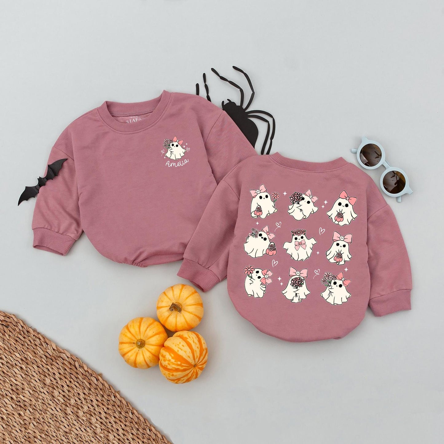 Custom Name Pink Ghost Baby Romper Adorable Halloween Baby Girl Outfit Cute Ghost Spooky Season Personalized Gift Idea