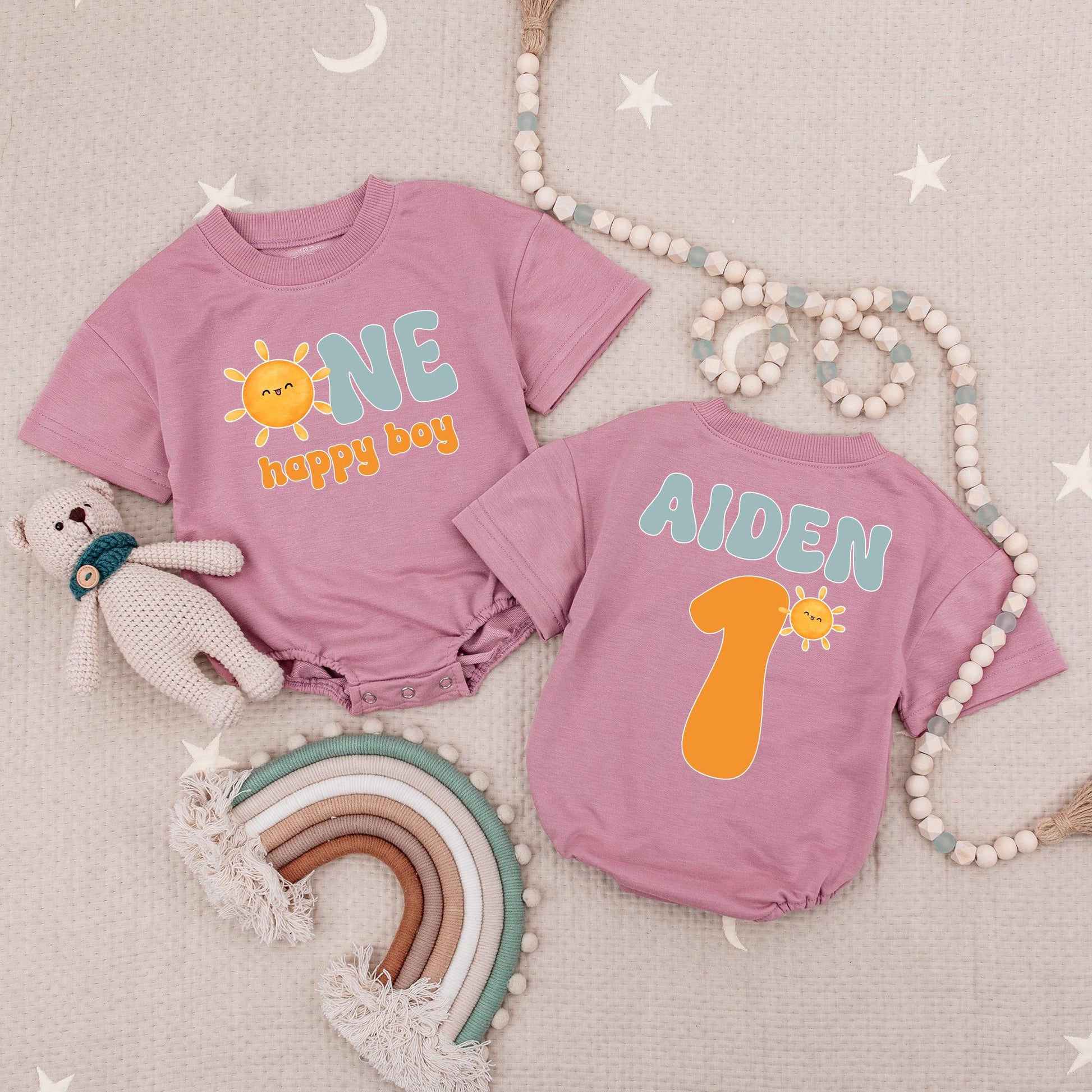 Custom Name Sun First Birthday Baby Romper Happy Boy Retro 1st Birthday Sun Babysuit Theme Outfit Celebration Cotton