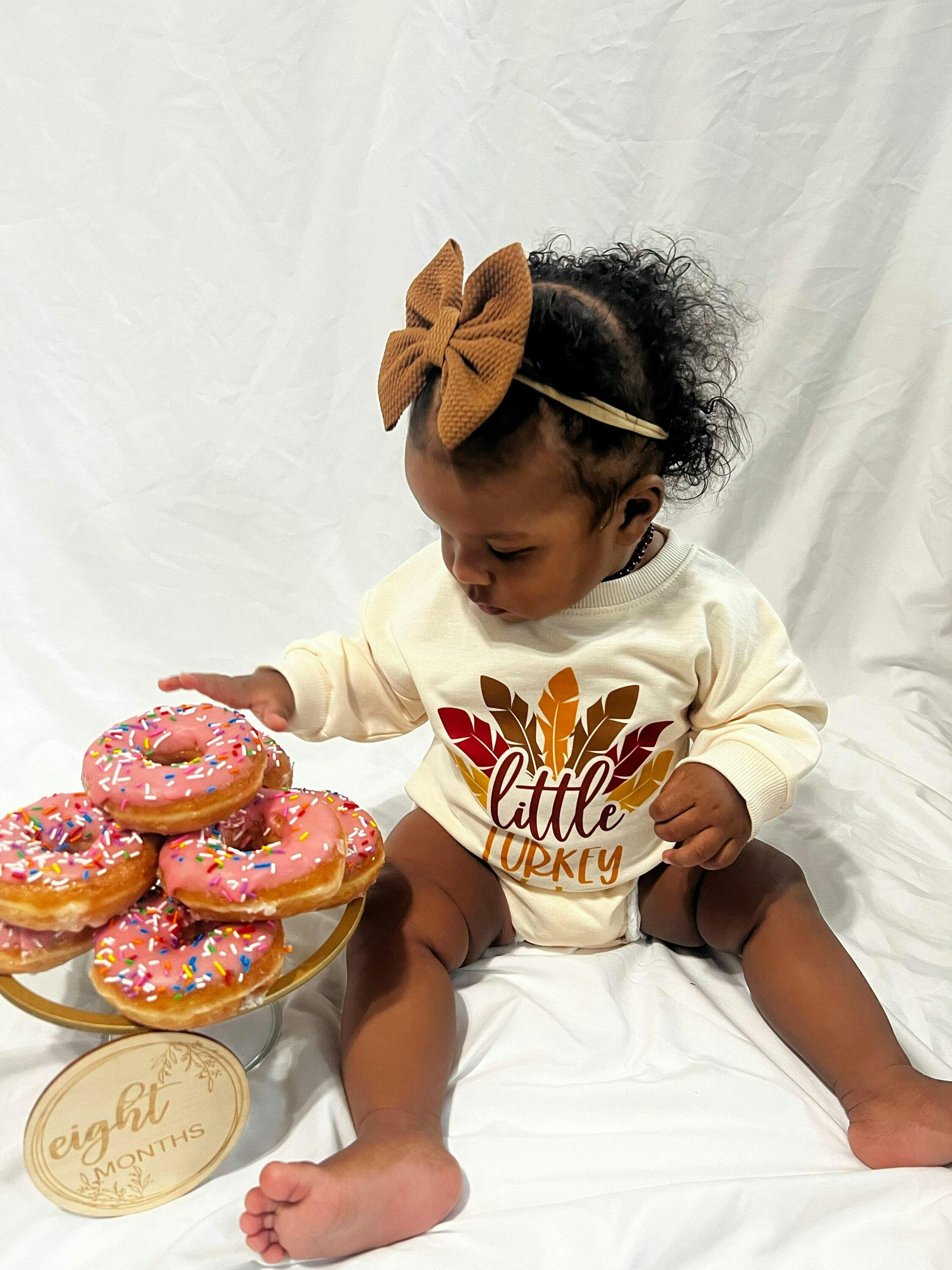 This adorable Little Turkey romper is the perfect way to celebrate your little one's first Thanksgiving! Imagine your sweet baby in this cozy long-sleeved bodysuit, ready for fall family photos and a delicious feast. It's the ideal outfit for a baby announcement or a precious coming-home moment, creating memories you'll cherish forever. Wrap your little turkey in love and style this holiday season!