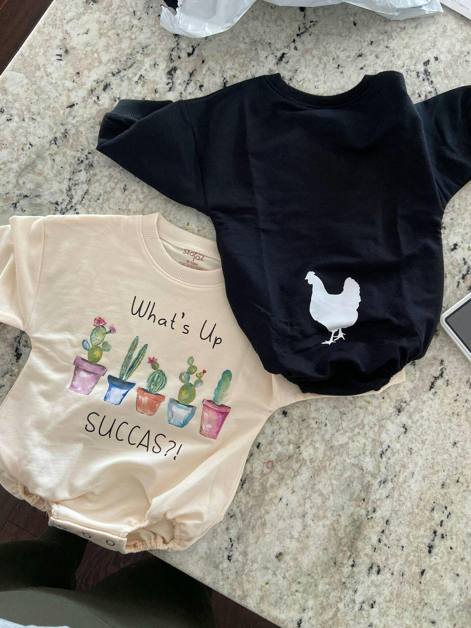 Lionel K. Watson Loved these cute sweatshirt onsies. I would like to suggest changing the image on "what's up succs!" From cacti to succulents. This didn't stop me from purchasing. Super cute.