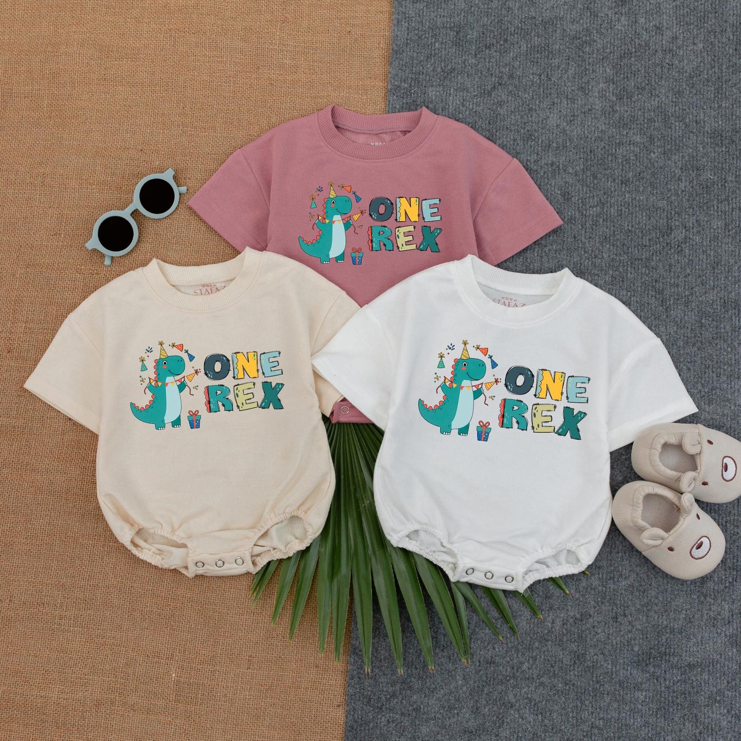 Celebrate your little one's big day with this adorable dinosaur birthday romper! Picture the sheer joy on your baby boy's face as he turns one, sporting this cute "One Rex" themed outfit. Crafted for comfort with short sleeves and a playful bubble romper design, it's perfect for his first birthday bash or a fun summer celebration. Imagine the adorable photos you'll capture as he toddles around in this charming dinosaur attire. This romper isn't just clothing; it's a memory in the making, a cozy and stylish way to mark this special milestone. Make his first birthday roar-some with this delightful gift!
