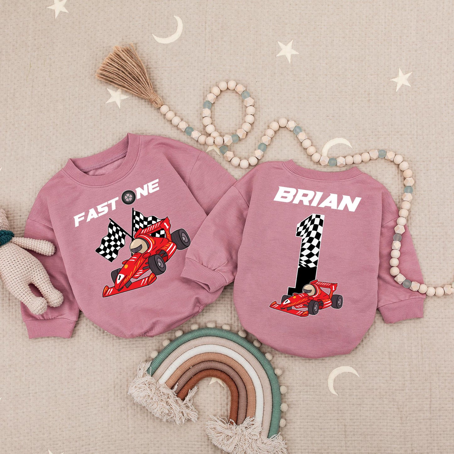 Get ready to celebrate your little one's first lap around the sun with this adorable race car themed romper! Featuring a bold red race car and fun checkered flags, this outfit is perfect for a 'Fast One' birthday party. The design includes playful details like a tire replacing the 'O' in 'ONE', making it a truly unique piece. Imagine the smiles and photos as your baby speeds into their first year wearing this comfortable and stylish bodysuit. Whether it's for a birthday bash or a fun photoshoot, this race car outfit is sure to be a hit. Get yours today and make their first birthday unforgettable!