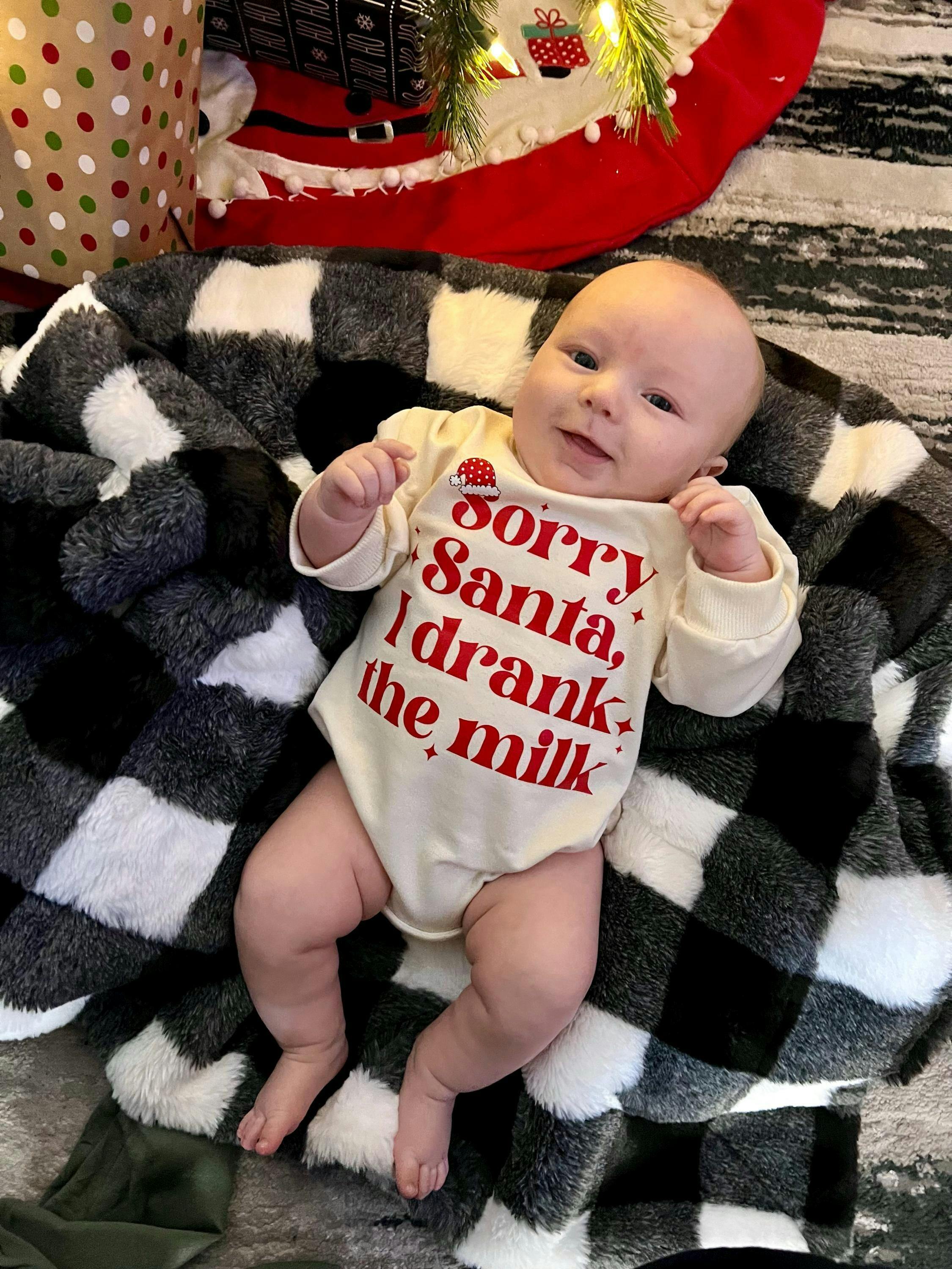 Picture your little one stealing hearts this Christmas in our 'Sorry Santa, I Drank the Milk' romper! This adorable Western-themed outfit is perfect for baby's first Christmas memories. Imagine those precious photos by the tree, showcasing the darling design on this cozy newborn bodysuit. It's a unique baby shower gift that's sure to bring smiles. The soft fabric ensures baby's comfort, whether at a festive gathering or a quiet family night. Capture the magic of Christmas with this charming romper, a sweet keepsake for years to come. Make this first Christmas extra special with a touch of western charm. It's the perfect blend of cozy and cute for your little one's holiday debut. This festive season, give the gift of adorable memories!