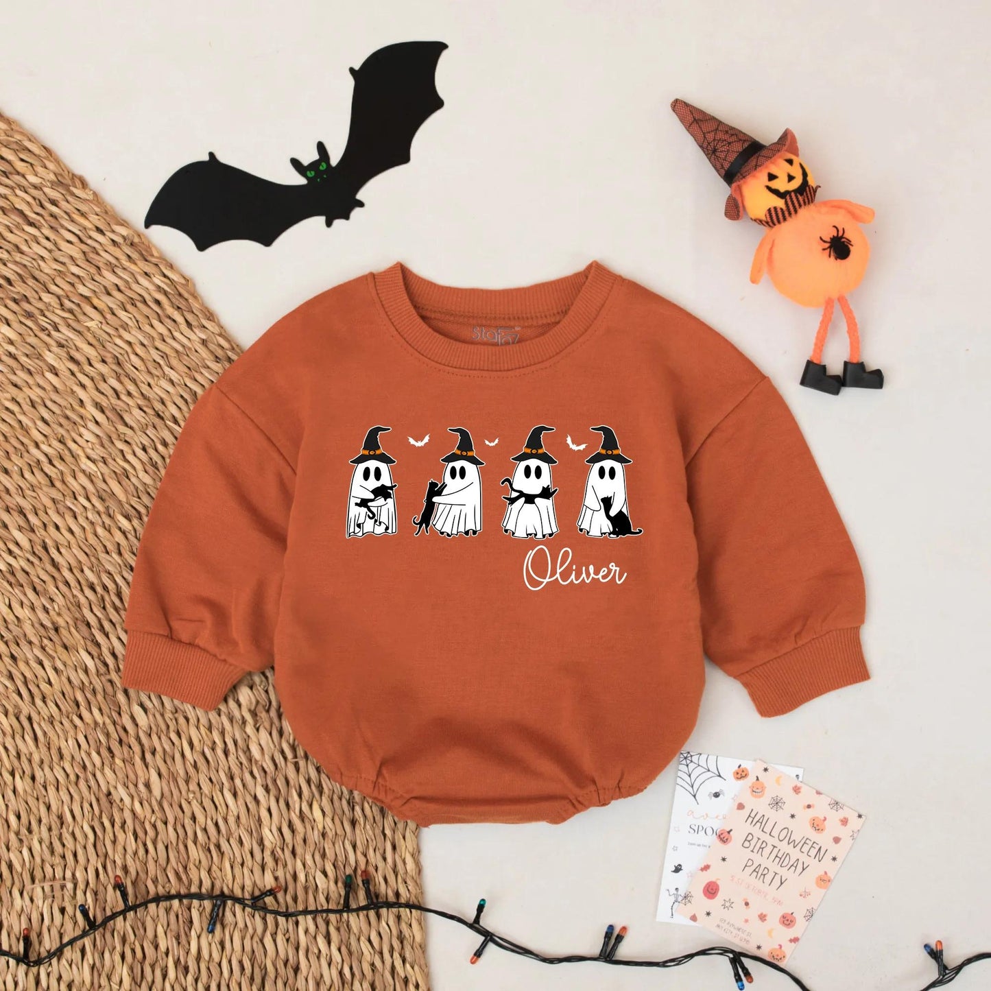 Ghost Crew Cats Baby Romper Custom Halloween Outfit Personalized Fall Name Gift Spooky Season Infant Wear