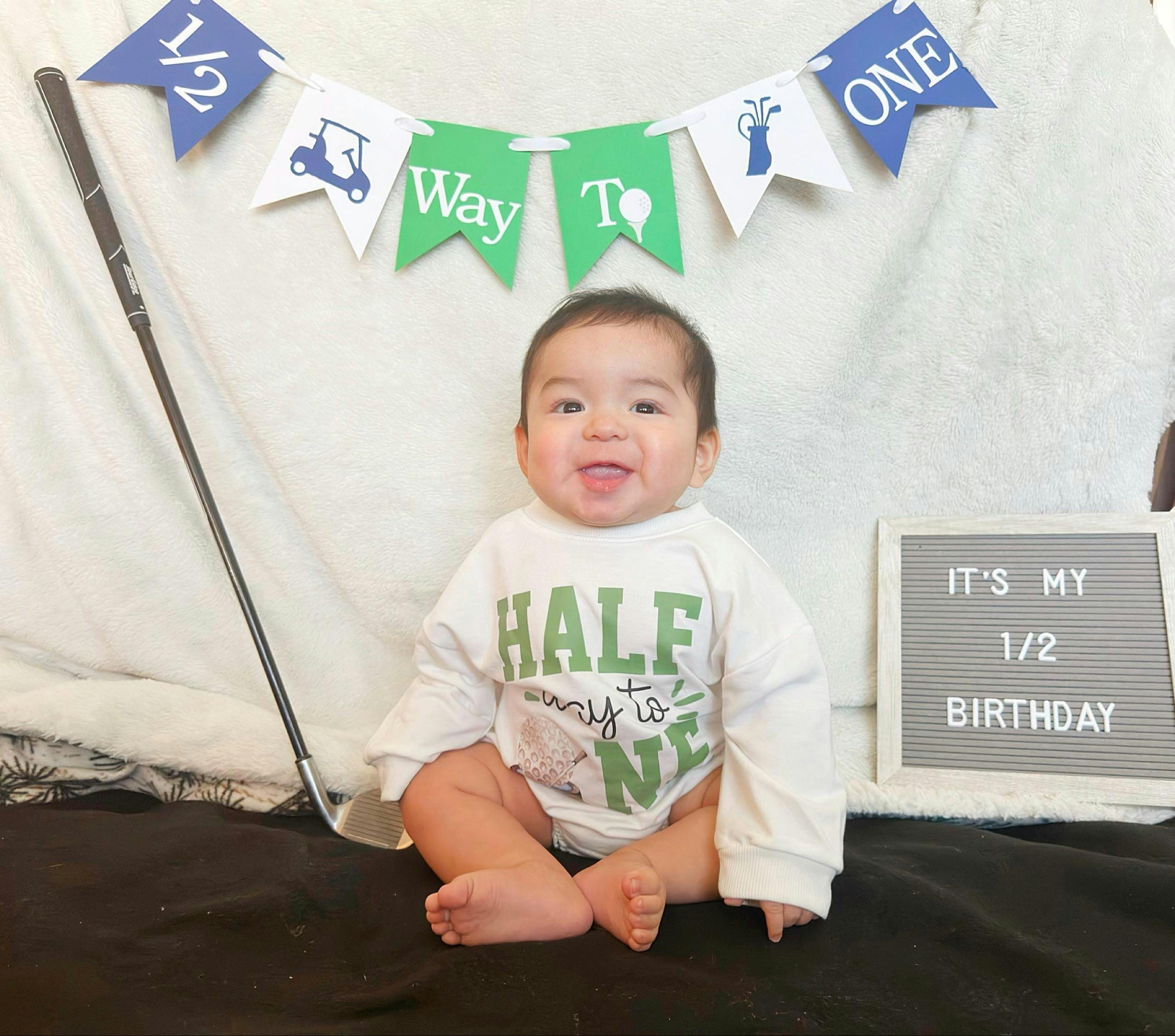 Celebrate a "HALF way to ONE" milestone with this adorable golf-themed bubble romper! Featuring playful green text and a charming grey and black golf ball and tee graphic, this outfit is perfect for your little one's half-birthday bash. The back proudly displays 'FLETCHER' in vibrant green, above a striking '1/2' in a sporty diamond harlequin pattern of greens and blues. Designed for a playful and sporty vibe, it's ideal for capturing those precious half-birthday memories or for any golf gameday. Dress your baby in this unique and festive romper to make their half-year celebration a hole-in-one!