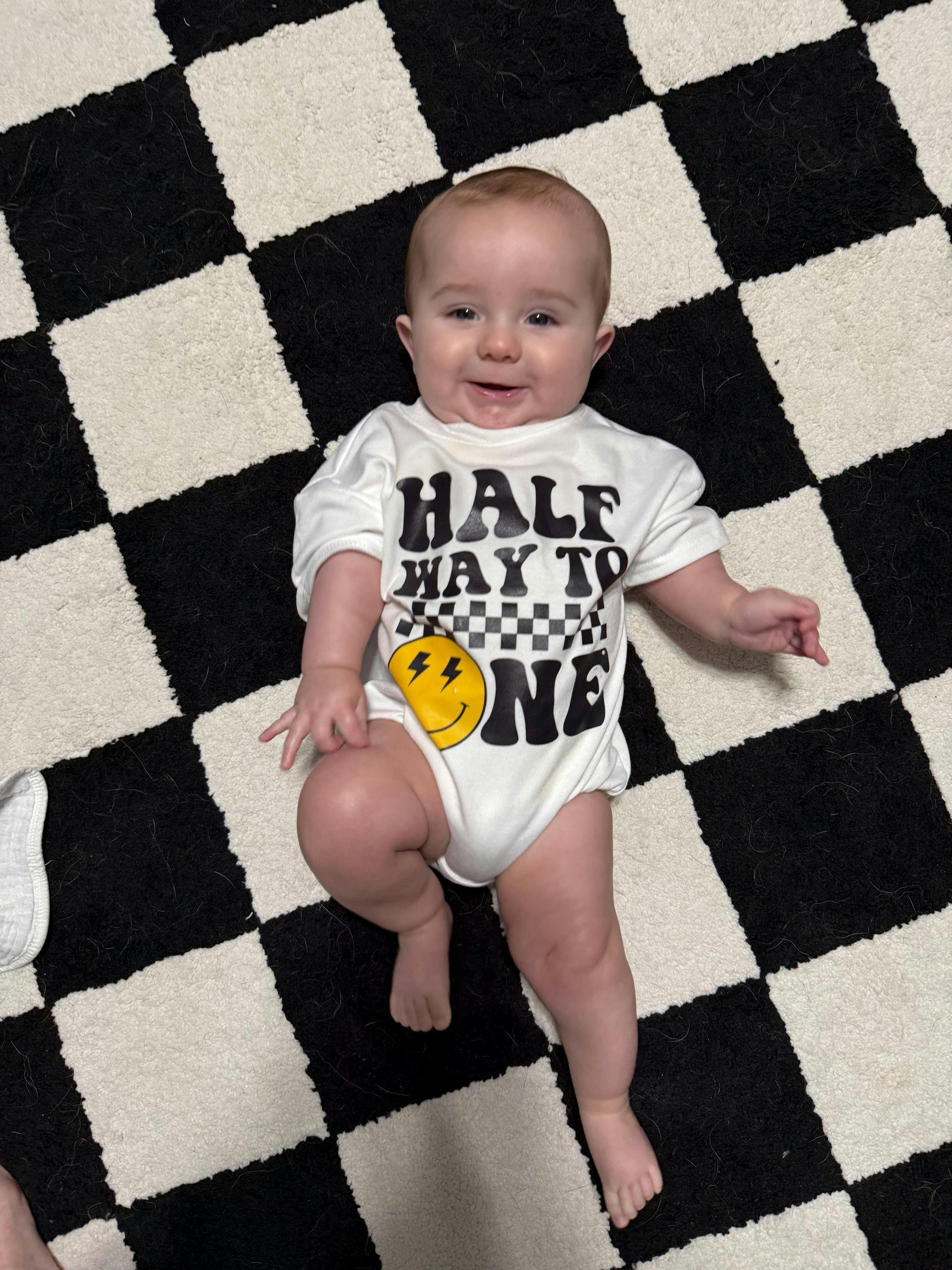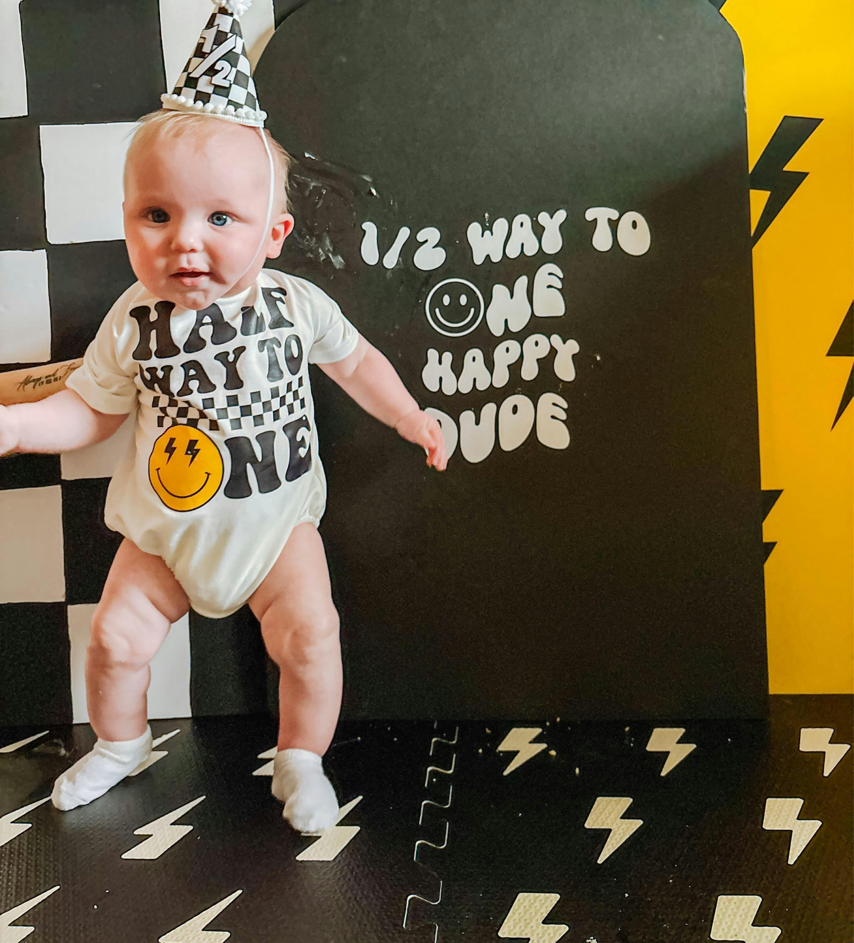 Celebrate that adorable "halfway to one" milestone with this super cute bubble romper, perfect for your little "one happy dude"! The playful design features retro vibes with a vibrant yellow smiley face sporting lightning bolt eyes, all separated by a classic checkered line. It's the perfect outfit for capturing those precious early birthday memories or as a heartwarming baby shower gift. Imagine your little one rocking this on their special half birthday, spreading smiles and charm all day long! Crafted for comfort and style, this romper makes a delightful addition to any baby boy's wardrobe, symbolizing a fun and joyous stage of growth.