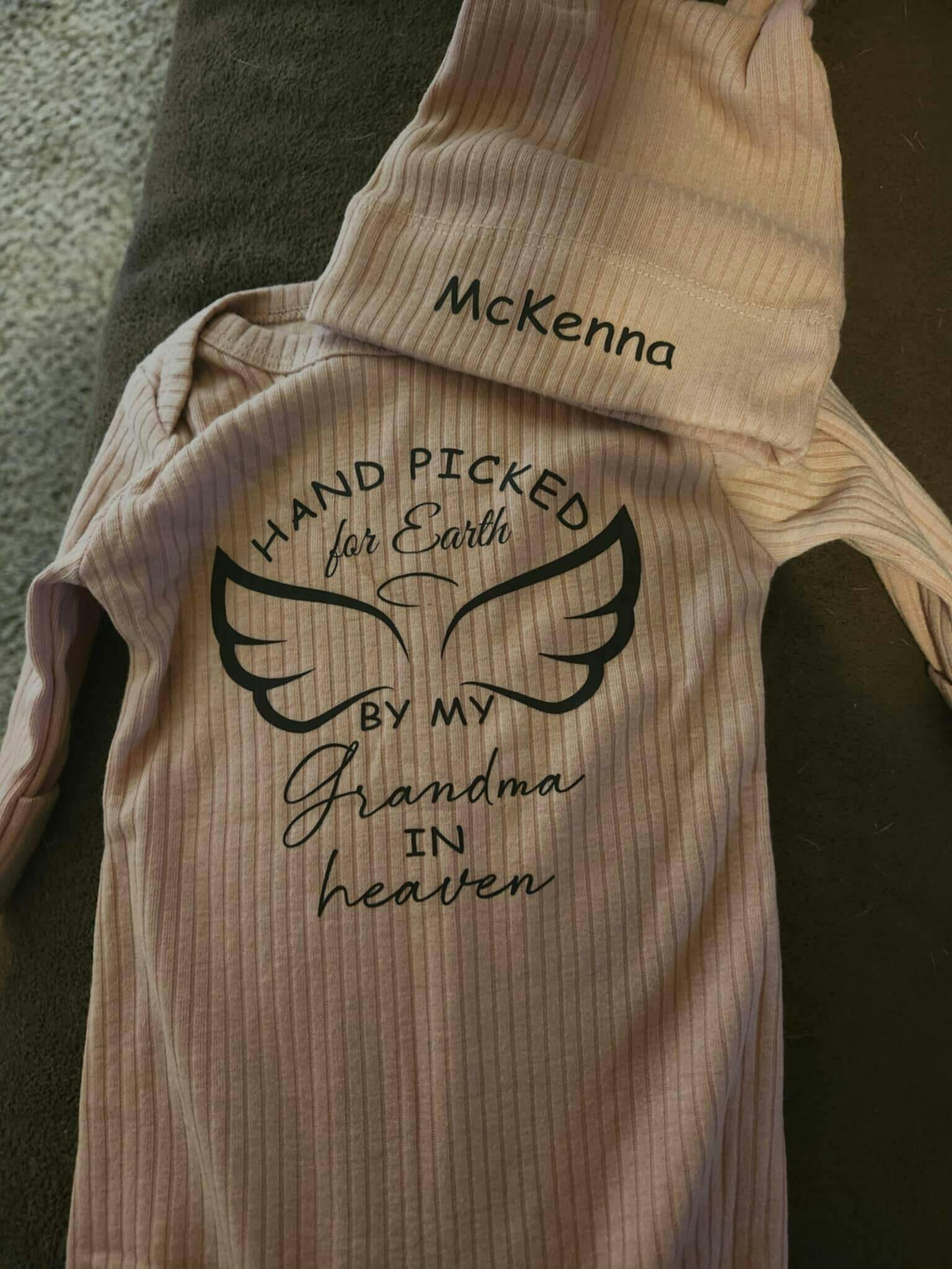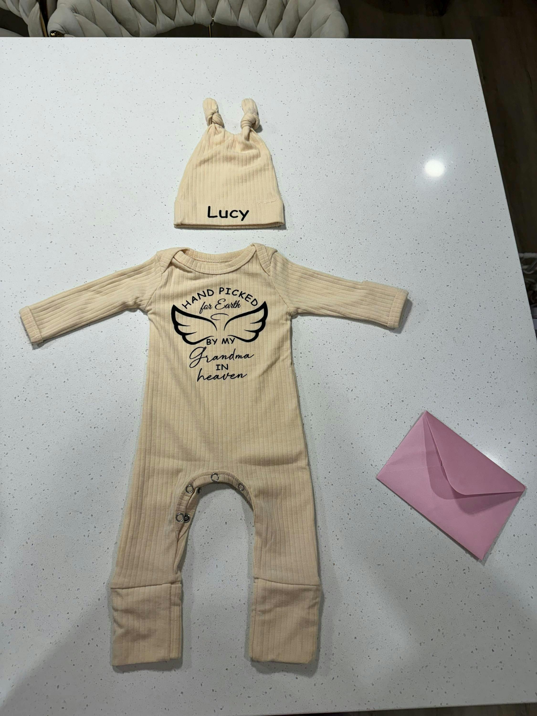 Imagine the heartwarming moment you share your incredible news with loved ones, or when gifting a truly special welcome to a new little family member. This precious baby bodysuit features a deep black design centered on the chest, bearing the profoundly sentimental message "HAND PICKED for Earth BY MY Custom IN heaven". Above this vertically stacked phrase, delicate angel wings softly frame the words, topped by a subtle, faint halo, creating a modern yet deeply touching aesthetic. Perfect for a memorable pregnancy announcement or as an incredibly thoughtful baby shower gift, this bodysuit becomes a beautiful keepsake, symbolizing eternal love and remembrance. Picture your little one wearing this sweet piece, a gentle nod to a beloved great-grandparent watching over them, making every moment even more meaningful. It’s more than just clothes; it’s a treasured memory in the making, ready to be part of your family’s most cherished stories. Embrace this beautiful sentiment and create a truly unforgettable welcome for your precious arrival.