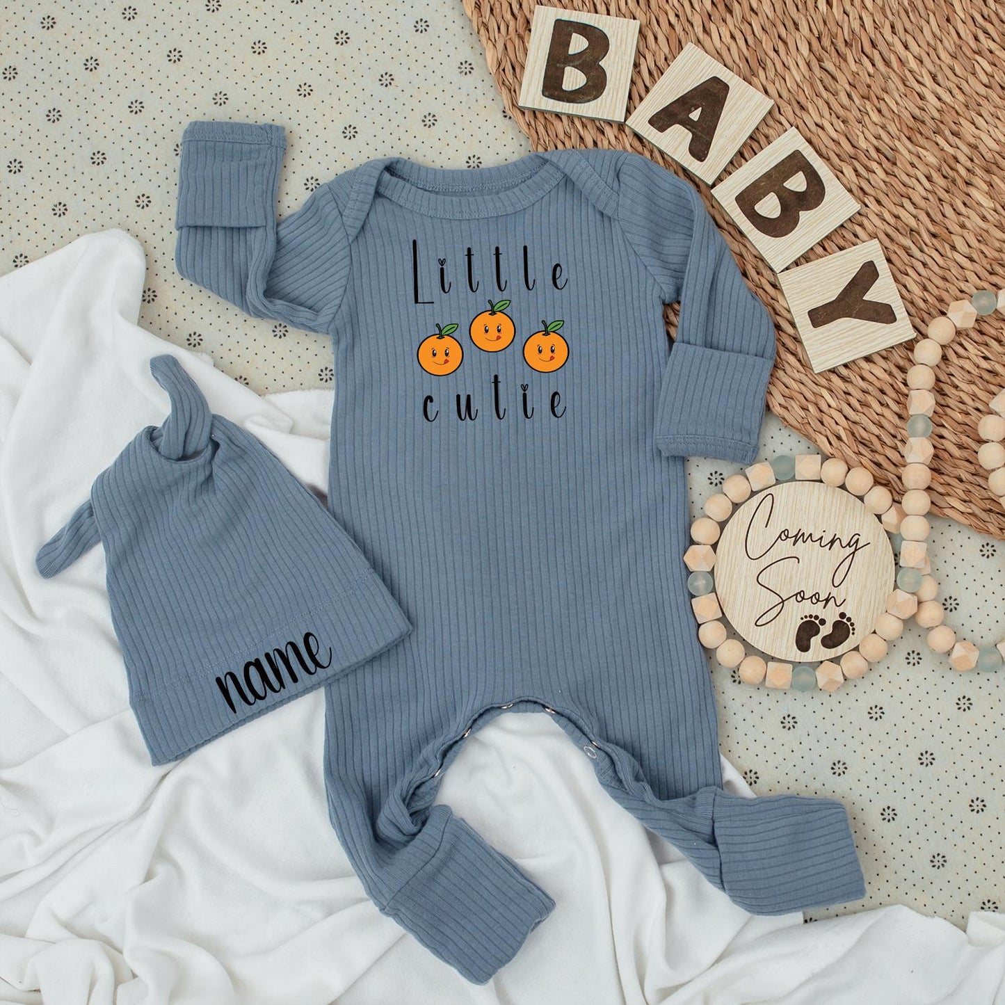 Welcome your little cutie to the world with this charming bodysuit and hat set! Picture the sweet moment of bringing your newborn home in this adorable outfit. The bodysuit features the playful phrase "Little cutie" surrounded by delightful cartoon-like oranges with the cutest expressions. The matching hat is personalized with their name in a lovely cursive font, making it extra special. Crafted from soft, baby-friendly fabric, this set is perfect for those precious first photos or a thoughtful baby shower gift. Imagine the smiles and giggles as your little one sports this darling ensemble! This set is not just an outfit; it's a memory in the making. Let this sweet set announce your baby's arrival in the most adorable way.