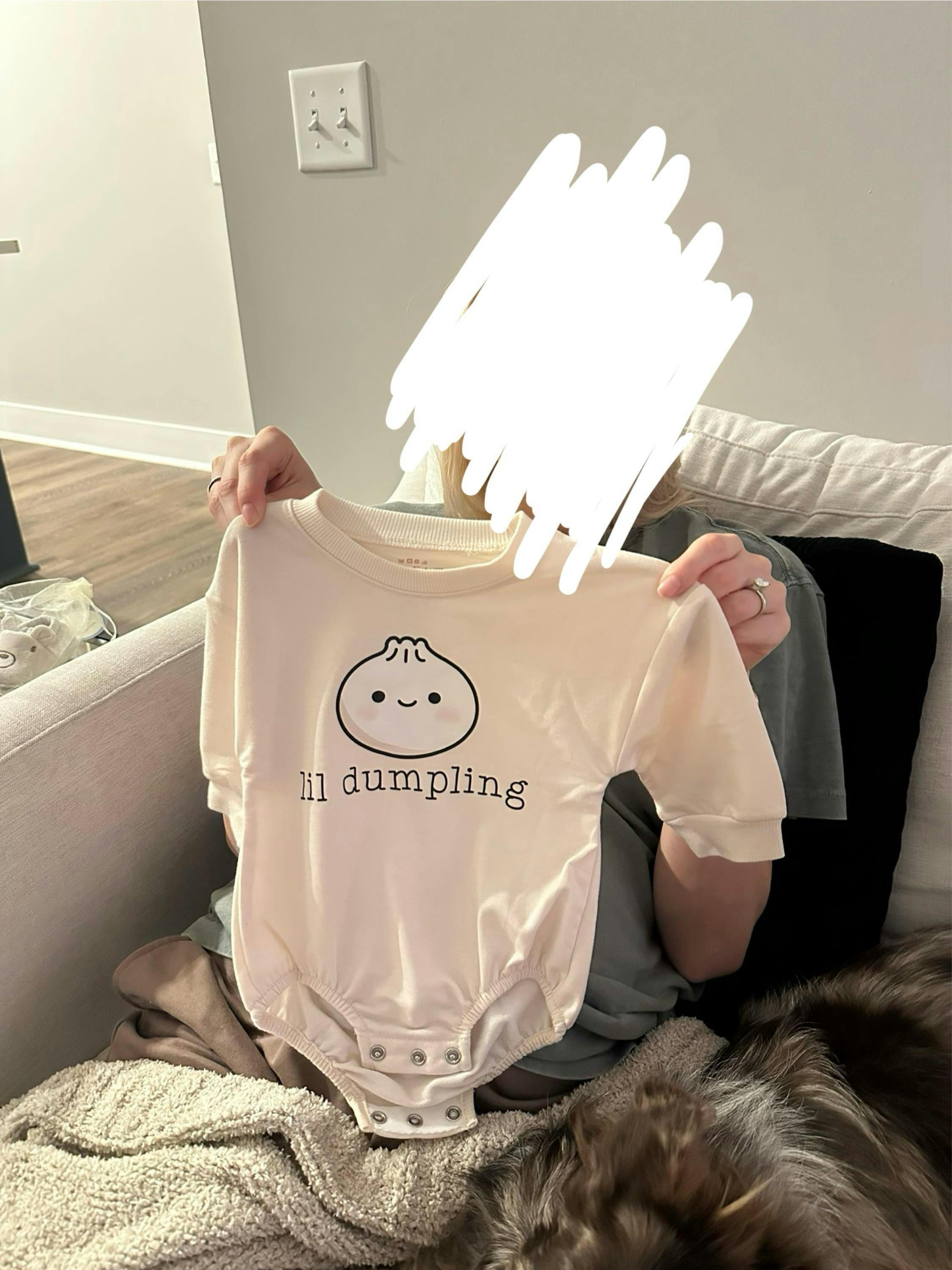 Imagine the sweet giggles as your little dumpling waddles around in this adorable romper! This vegan baby bodysuit features a charming dumpling design, perfect for a foodie family. Picture your baby dressed up for a casual dim sum brunch or a fun baby shower costume party. It's not just baby clothes; it's a conversation starter! Soft, comfortable, and irresistibly cute, this romper makes an ideal baby shower gift or a unique 'food baby' announcement. Made for comfort and cuteness, this outfit is perfect for playtime, photoshoots, or just snuggling. Share the love of delicious food with the world with this whimsical design that's sure to bring smiles. Snag this sweet treat for your little one or gift it to expecting parents!