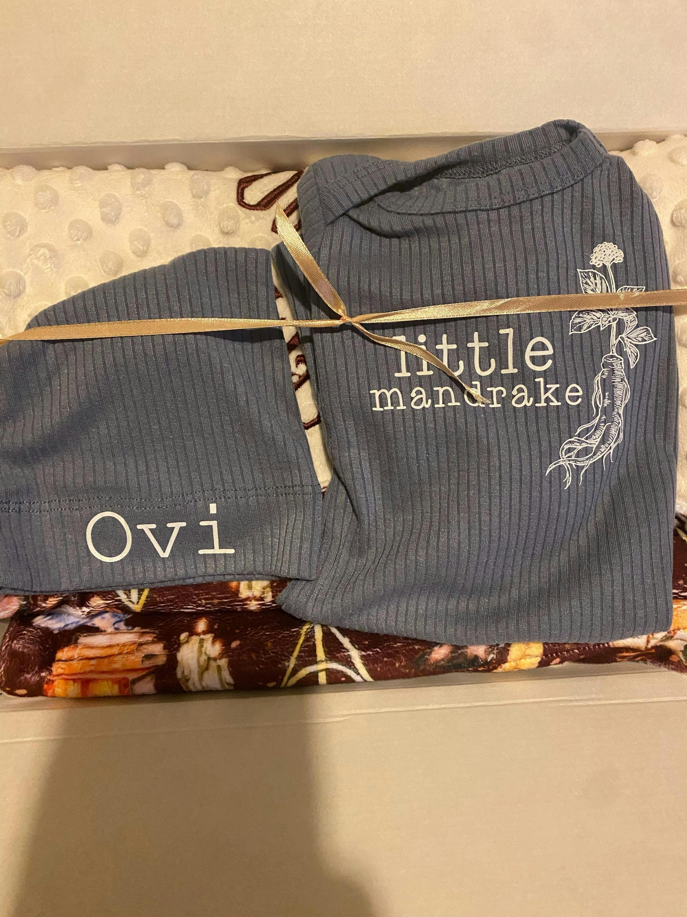 Welcome your little sprout into the world with this enchanting Little Mandrake baby bodysuit and matching hat set. Crafted with soft, comfortable fabric, this magical outfit features a minimalist black ink design of a charming mandrake plant with intricate roots and leaves, perfectly complemented by the stacked "little mandrake" text. The cozy beanie can be personalized with your baby's name, like 'William' shown, making it a truly unique keepsake. Perfect for a memorable going-home outfit, a cherished new baby gift, or simply adorable everyday wear, this unisex set adds a touch of whimsical wonder to any moment. Gift a piece of magic and watch their tiny adventures bloom.