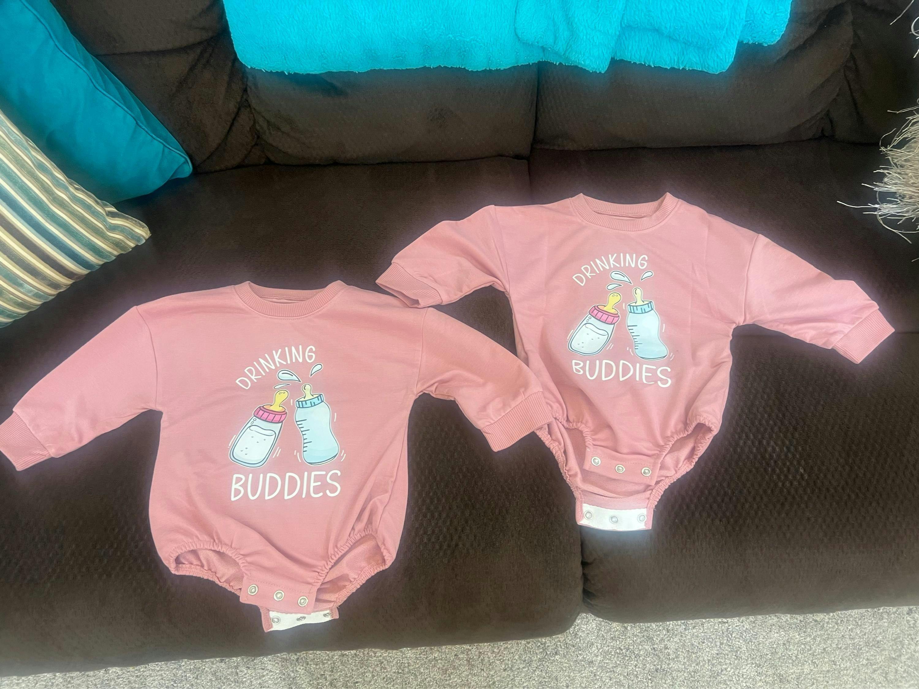 Imagine the adorable giggles and double trouble your little ones will bring, dressed in our charming 'Drinking Buddies' romper. This playful design features two delightful baby bottles, one with sweet pink accents and the other with cool blue, merrily clinking together above the bold text "DRINKING BUDDIES." Outlined in black with a little splash of excitement, the cartoonish aesthetic captures their playful spirit perfectly. This Twin baby clothes is more than just a cute twin outfit; it's a sweet nod to their lifelong bond as best friends, making it an unforgettable choice for twin reveals, baby showers, or simply matching outfits that highlight their unique connection. Perfect for capturing precious photos or everyday adventures, this comfortable bodysuit celebrates their bestie bond right from the start. Cherish these early memories by dressing your little 'drinking buddies' in an outfit that truly celebrates their special connection.