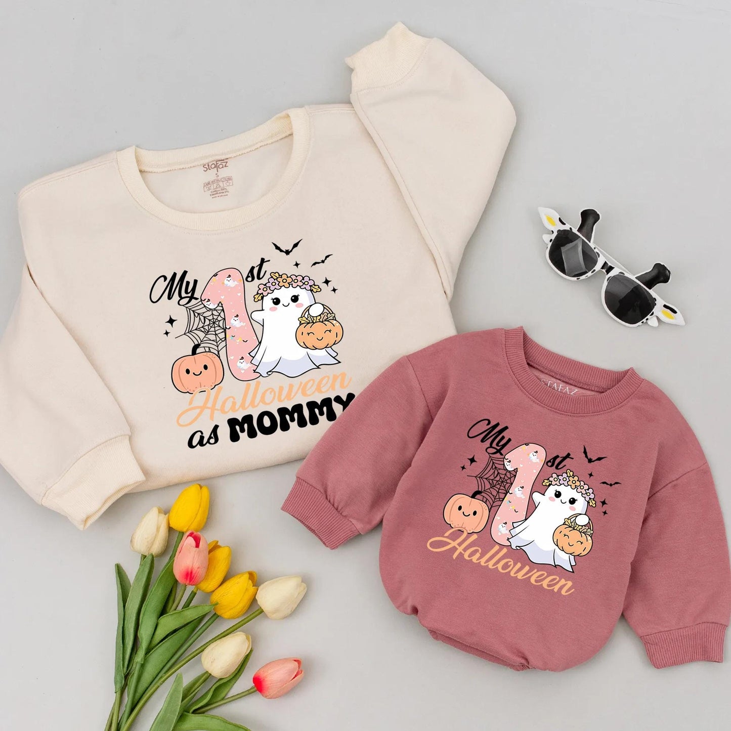 Capture the magic of your little one's very first Halloween with this absolutely adorable "My 1st Halloween" baby romper. Imagine those precious giggles as they explore the spooky season for the first time, looking absolutely darling in this sweet and playful design. Featuring a charming pink number one filled with playful white ghosts, a cute pumpkin with a simple, friendly face, and a white ghost joyfully holding a pumpkin basket amidst a scattering of flowers, this outfit is pure enchantment. Delicate spiderwebs, tiny bats, and twinkling stars add to the festive spirit, all brought to life in a delightful palette of black, white, pink, orange, and touches of yellow. It’s the perfect ensemble for creating cherished memories during your baby’s inaugural Halloween celebration, making it a truly special keepsake for you and your family.