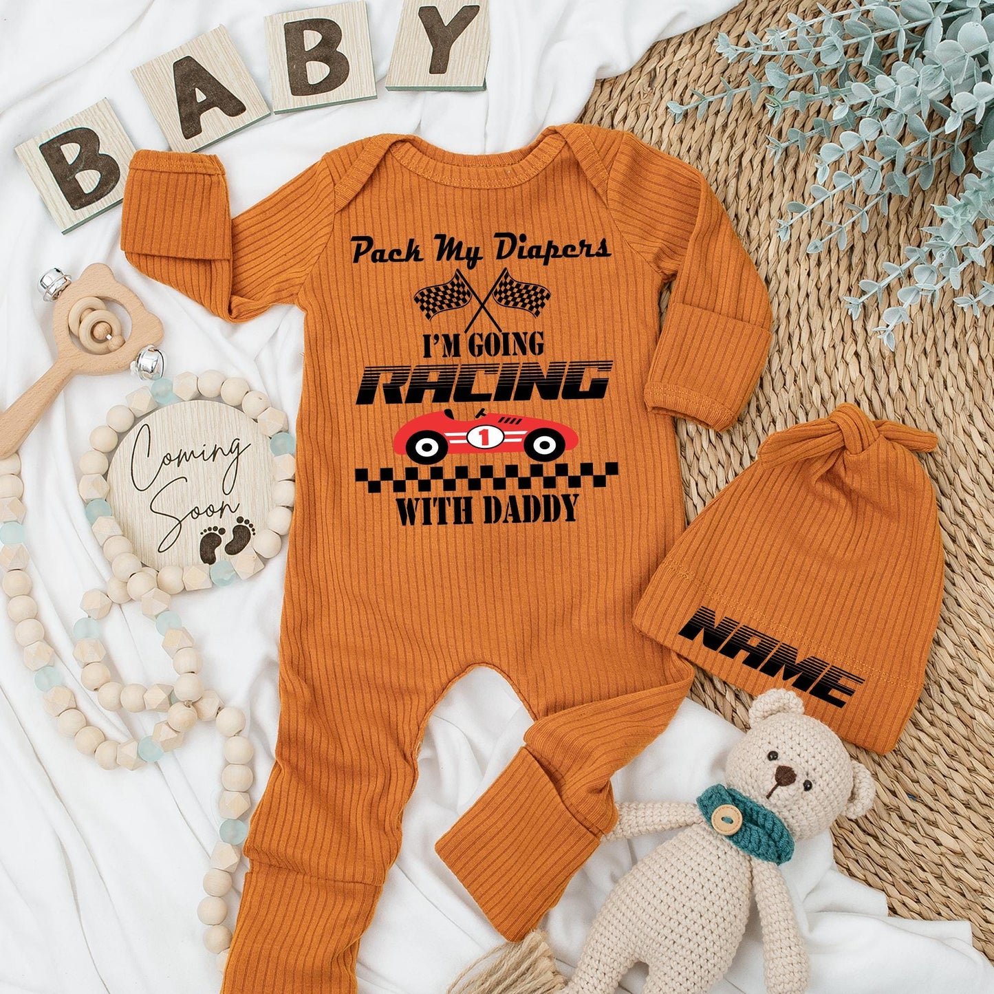 Get ready for some fast-paced fun with your little racer! This adorable baby bodysuit captures the excitement of race day with a playful design featuring crossed checkered flags, a triumphant race car with the number one, and bold text that proclaims "Pack My Diapers, I'm Going Racing With Daddy." It’s the perfect way to announce your little one's arrival into the world of speed, making it an ideal outfit for a baby shower, a sweet Father's Day gift, or a memorable newborn announcement. Imagine the adorable photos you'll capture as your little one gears up for their first big adventure with Dad!