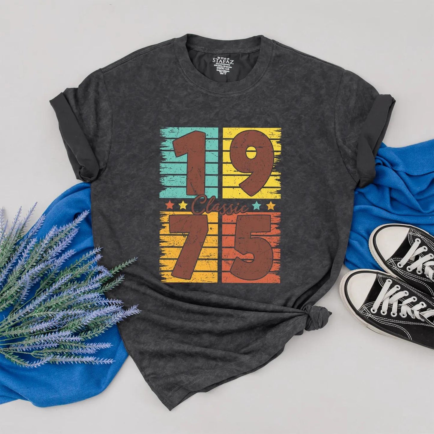 Celebrate a milestone birthday with our personalized 1975 classic shirt! Picture the joy of gifting a truly unique retro design. The shirt features the year in bold, horizontally striped blocks of turquoise, yellow, and orange, evoking a nostalgic vibe. Below, the word "Classic" is adorned with two gold stars. Perfect for a 50th birthday celebration, this custom shirt makes a thoughtful and memorable gift. Imagine the smiles and stories this vintage-inspired piece will spark. It's a comfortable and stylish way to honor a special year and create lasting memories. Customize it for a truly personal touch and give a gift they'll cherish. Order yours today and make their birthday unforgettable.