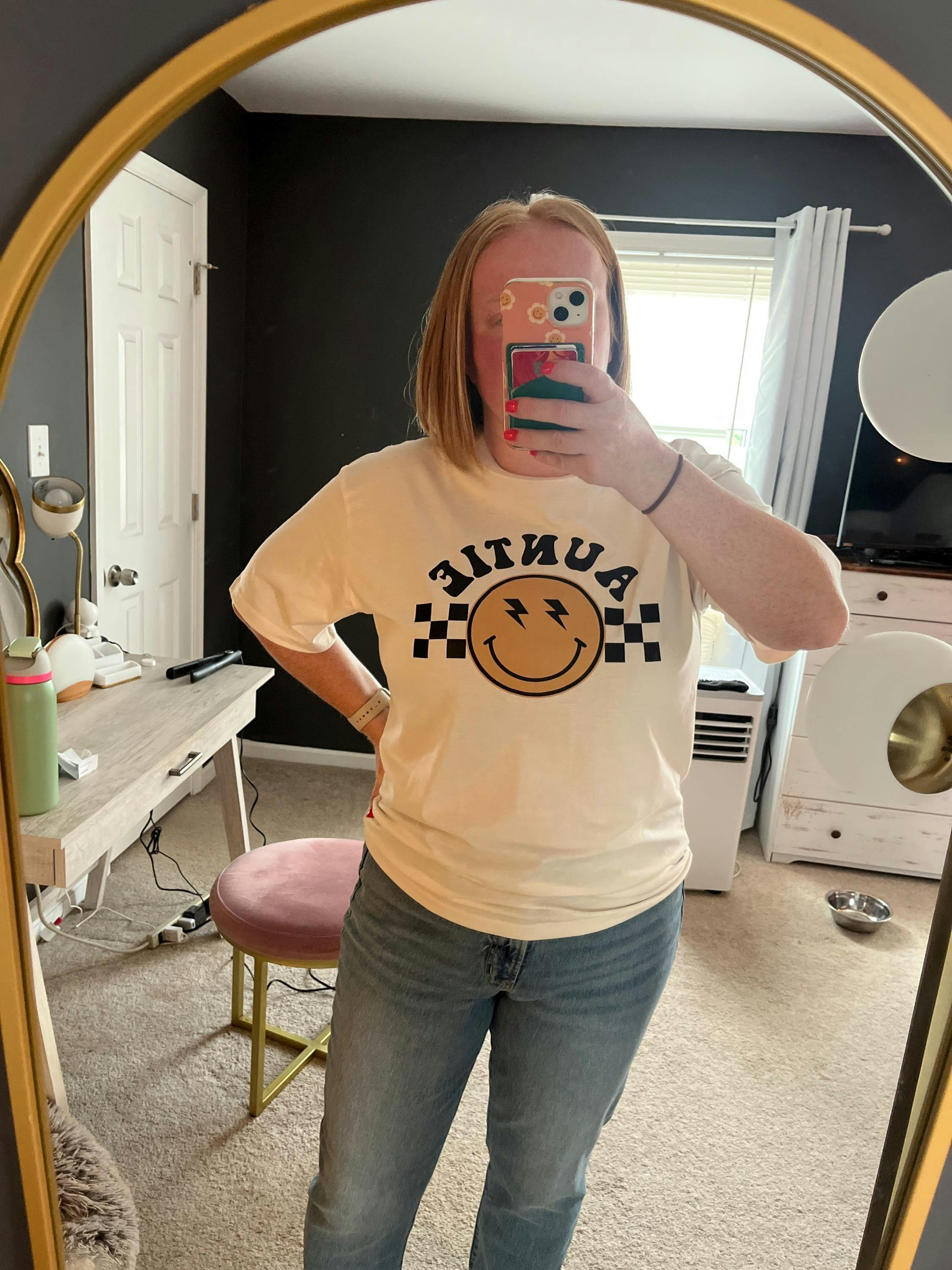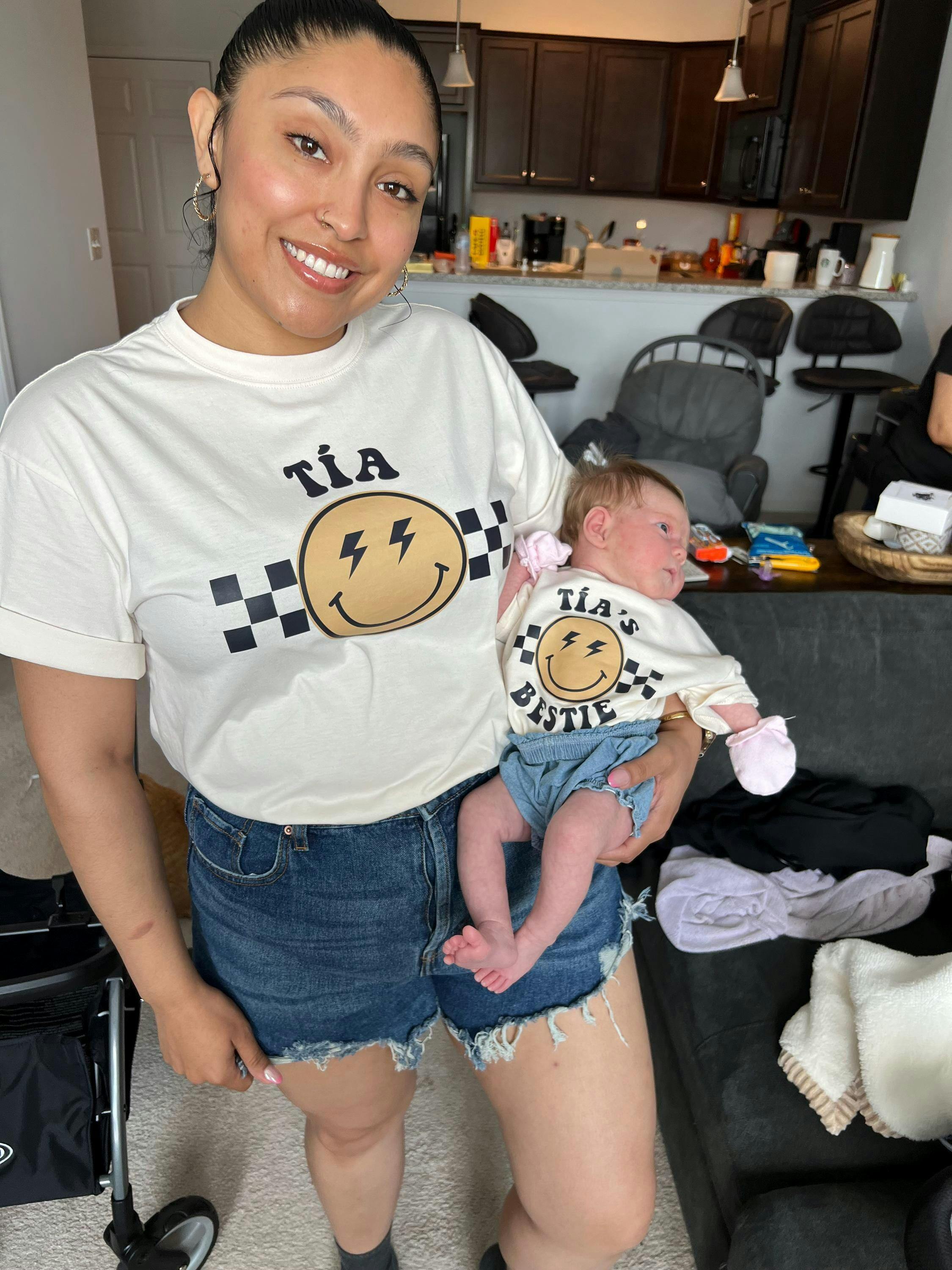 Imagine the joy of celebrating a new little one joining the family, or simply cherishing the unique bond with your favorite niece or nephew. This delightful tee captures that special connection with its vibrant retro-inspired design. It features the sweet declaration "Auntie" or "Auntie's Bestie" curving above a charming smiling face, complete with playful lightning bolts for eyes. Surrounded by a bold black outline and a cool black and white checkered pattern, the mustard yellow and black color palette truly makes this vintage aesthetic pop. It's the perfect cozy top for weekend adventures, family gatherings, or just snuggling up for story time, letting everyone know about that incredible aunt-and-mini bond. Make it extra special by personalizing this unique shirt, transforming it into a cherished keepsake that celebrates your one-of-a-kind relationship. It’s an ideal gift for an expecting aunt, a first-time aunt, or even for that established auntie who deserves to show off her love. Cherish every precious moment and let this tee be a fun, stylish symbol of the love that truly brightens your world.