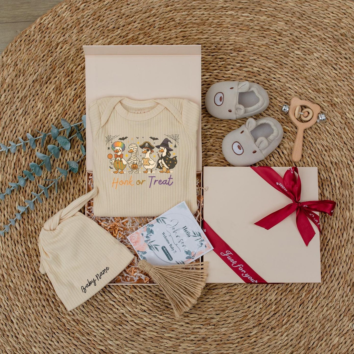 Get ready for the sweetest Halloween memories with your little one in this absolutely adorable personalized outfit. This whimsical romper features a charming parade of cartoon ducks, each delightfully dressed in their spooky best – you'll spot a clown, a mummy, a pirate, and even a witch! Above them, tiny bats flutter and stars twinkle, creating a truly magical scene. Below the playful characters, the festive phrase 'Honk or Treat' is printed in vibrant orange and purple, adding to the holiday cheer. Imagine your baby crawling or giggling in this soft, comfortable set, perfect for their first trick-or-treating adventure or a cozy fall photo shoot. It's designed to bring smiles and capture those precious, fleeting moments of their very first Halloween, making every cuddle feel extra special. Adding your baby’s name transforms this outfit into a cherished keepsake, a unique touch that makes it an unforgettable baby shower gift or a heartwarming coming-home ensemble. Celebrate the season of spooks and sweetness by making this personalized duck Halloween romper and hat a part of your family’s treasured memories.