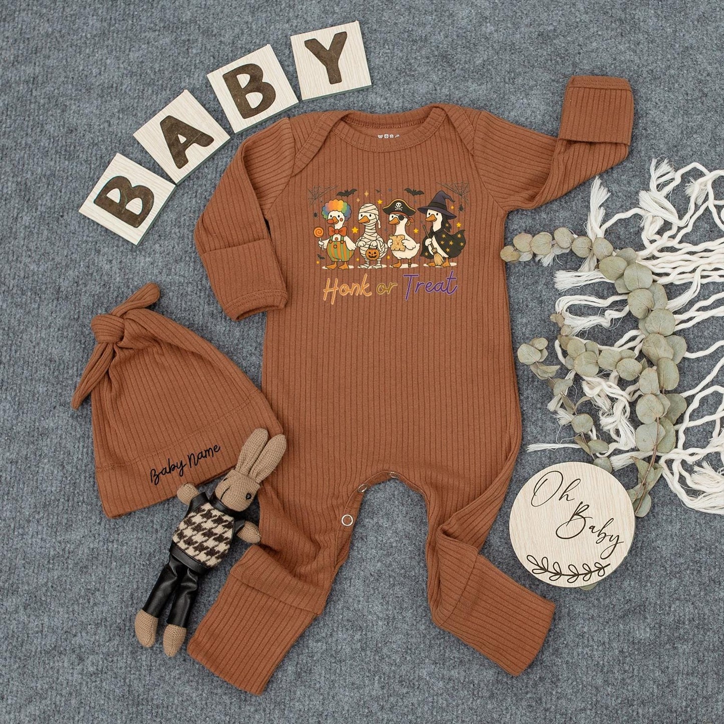 Personalized Baby Halloween Romper & Hat, Honk or Treat Duck Costume Outfit, Whimsical Clown Mummy Pirate Witch Infant Fall Shower Gift Coming Home