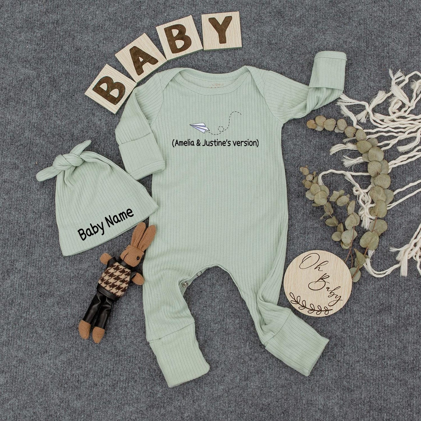 Personalized Baby Romper Set: Amelia & Justine's Airplane Gift with Name Beanie – Custom Newborn Outfit, Unique Auntie Present, Modern Minimalist Style 136