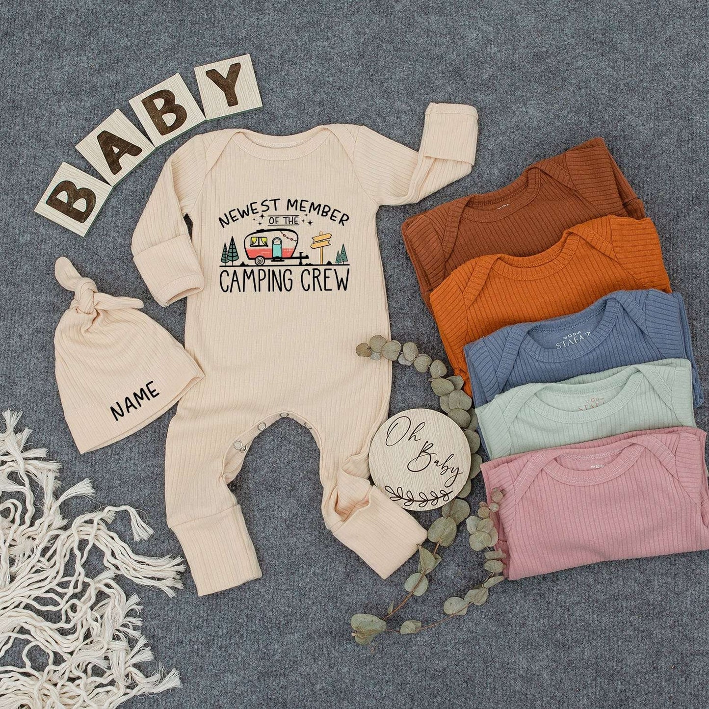 Welcome the newest little adventurer to the camping crew with this adorable bodysuit! Picture those sweet newborn snuggles in this soft, earth-toned romper. The vintage camper design, complete with red and turquoise accents and a retro signpost, brings a touch of nostalgia to your baby's wardrobe. Personalize it with their name to make it a truly special keepsake. Tiny starbursts add a whimsical touch, perfect for capturing those precious moments under the starry sky. It’s a unique gift for baby showers and a cozy outfit for everyday adventures. Celebrate your little one's arrival with a touch of retro charm. This custom bodysuit is sure to be a treasured piece in their wardrobe.