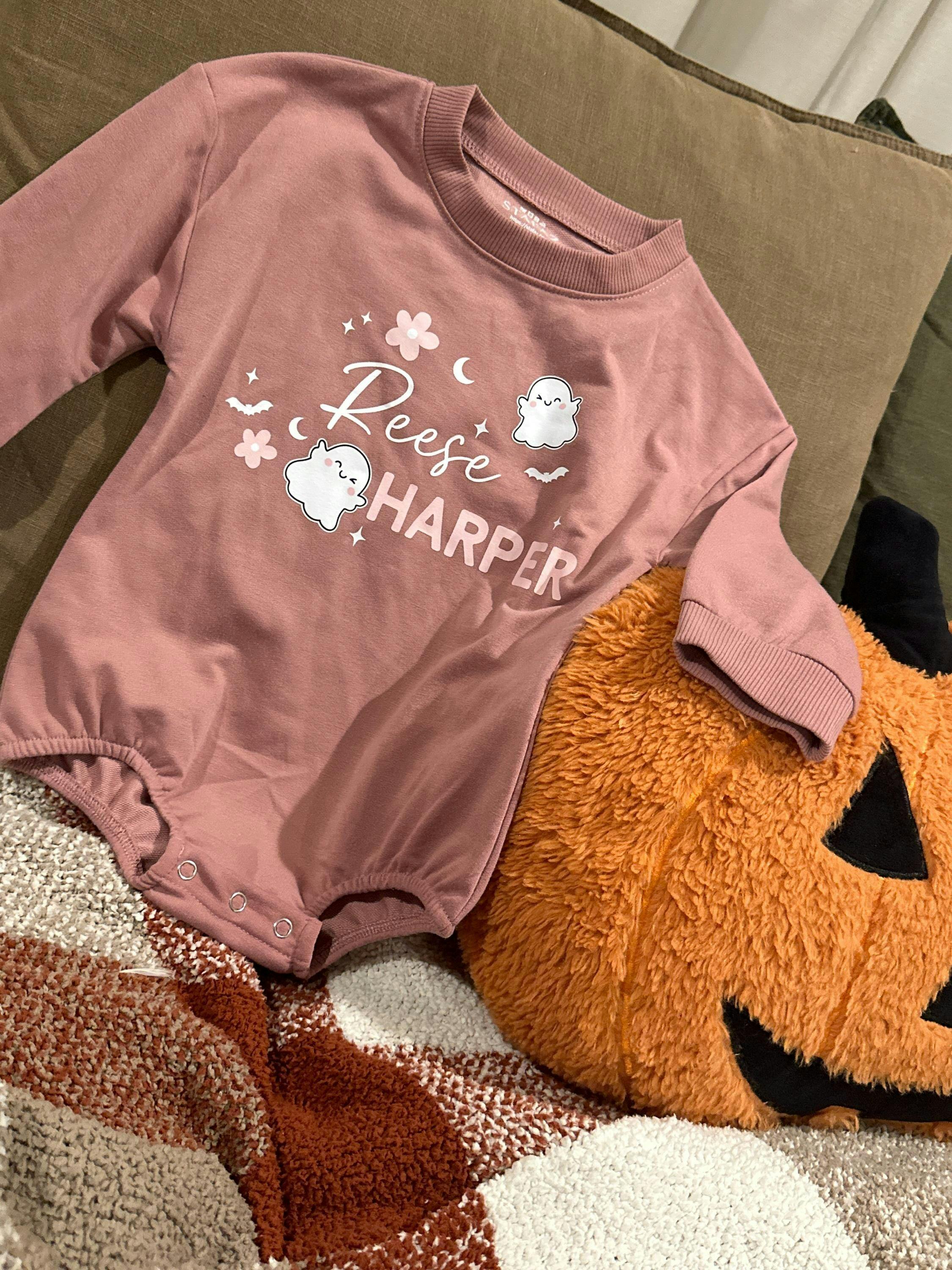 Dress your little one in spooky style with our custom ghost romper! Perfect for Halloween, this adorable bubble romper makes a unique baby shower gift. Made for cozy comfort, it's an ideal choice for fall outings or capturing festive memories. Personalize it for an extra special touch!