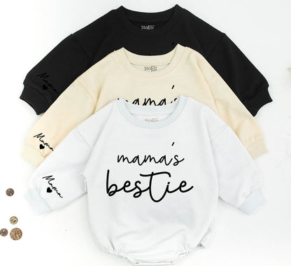 Celebrate the beautiful bond of motherhood with our heartwarming matching sweatshirt set, perfect for creating cherished memories. Each ultra-soft garment features whimsical cursive text: one proudly declares "mama" and the other "mama's bestie," embodying the special connection between mom and child. Further personalize your set with names like "Emily" or "Mama" elegantly printed on the sleeve, each accompanied by a sweet little heart, adding a unique sentimental touch. Imagine cozy weekends, memorable family photos, or simply enjoying everyday moments together in these minimalist, modern designs. These comfortable outfits make a truly thoughtful Mothers Day or new mom gift, strengthening family ties with every wear. Capture your unique story and express your love with this distinctive, personalized gift.