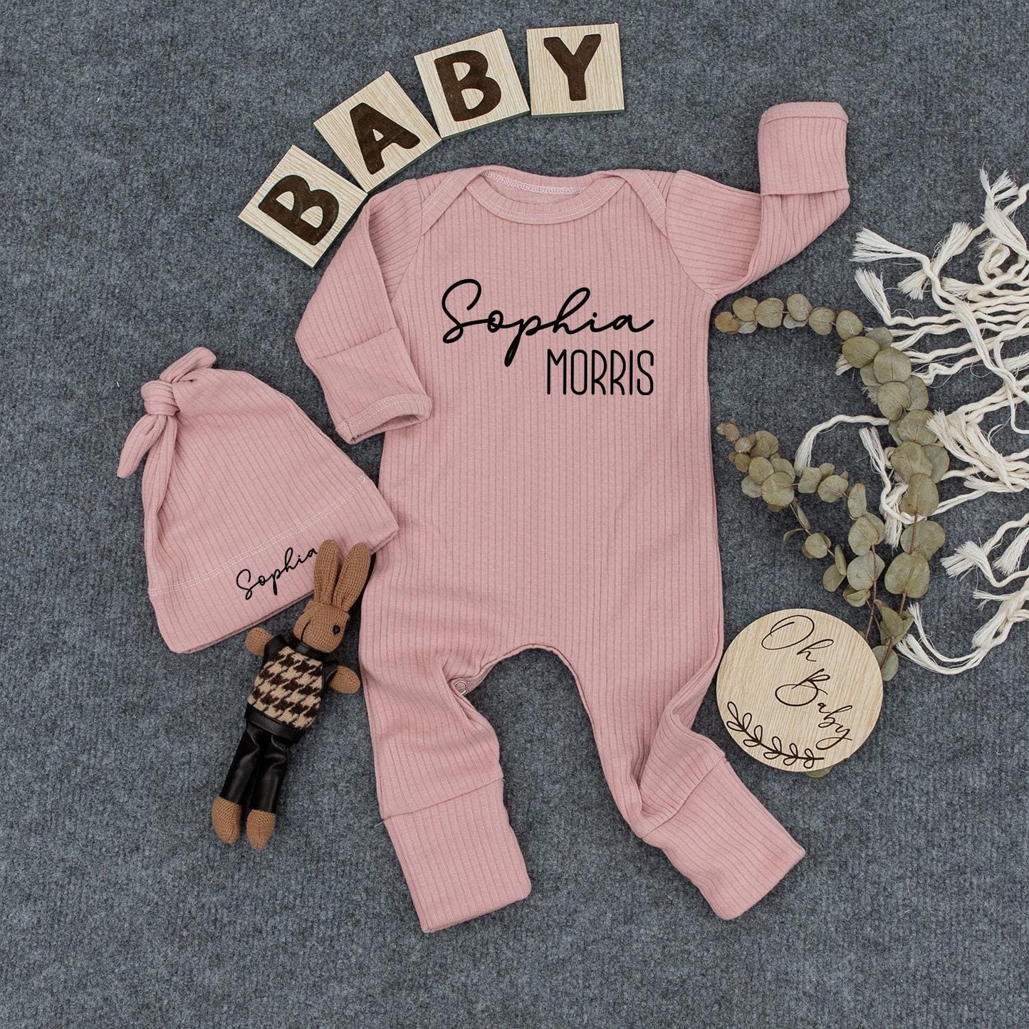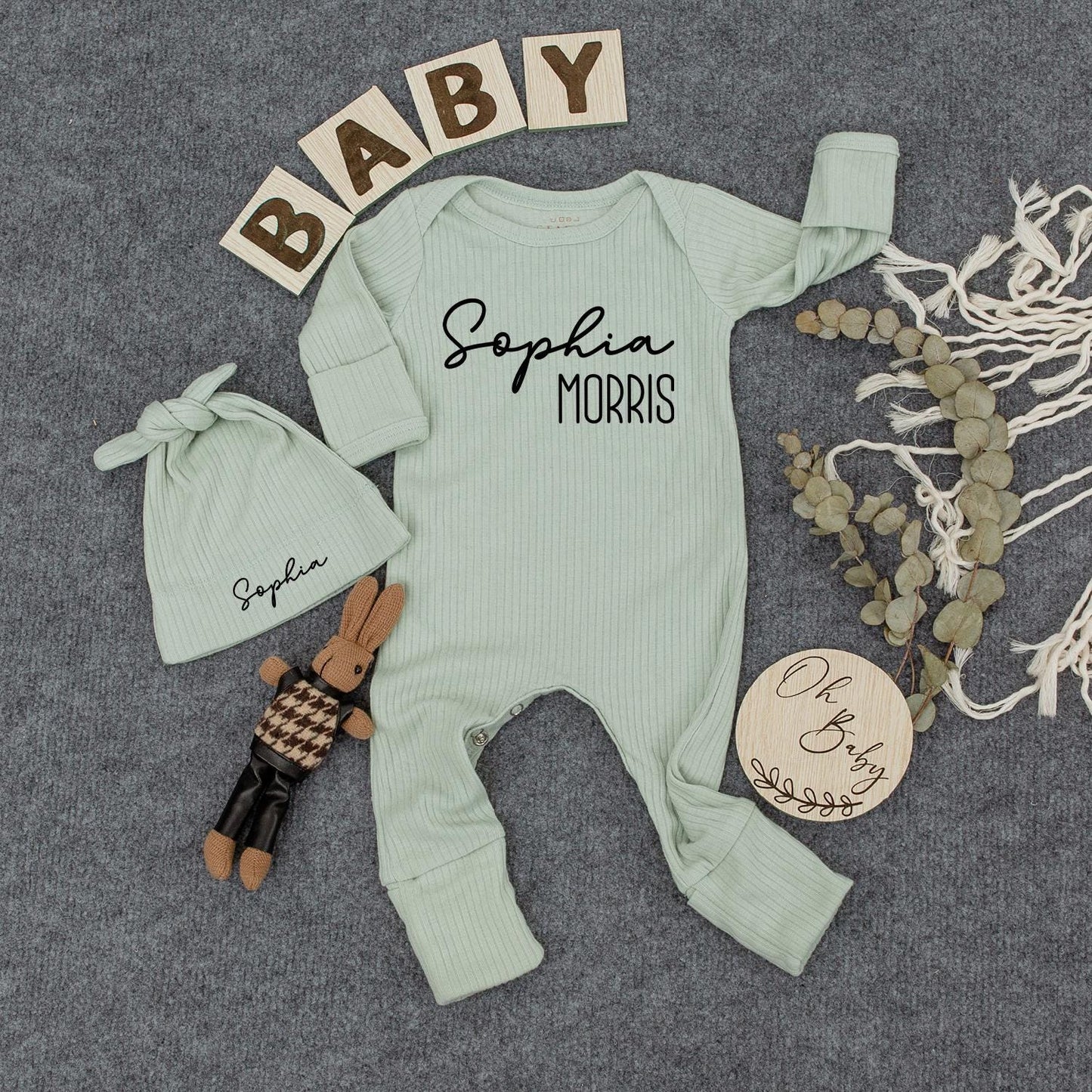 Personalized Modern Baby Bodysuit and Hat Set with Custom First Last Name Print Newborn Going Home Outfit Baby Shower Gift Idea