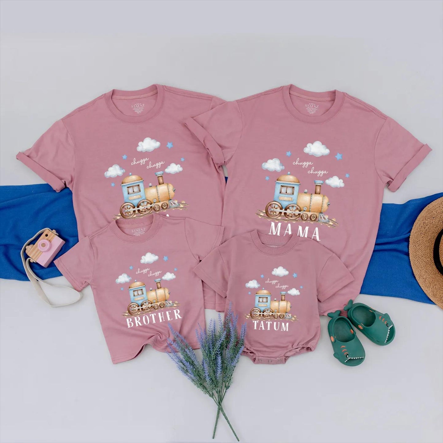 Picture the smiles and excitement as your little conductor celebrates his special day! This delightful Personalized Train Birthday Shirt and Romper set features a vibrant train design, complete with the playful 'Chugga Chugga' phrase. Designed for unforgettable moments, our matching family outfits strengthen bonds and create cherished memories. They are perfect for a coordinated birthday celebration or a fun photoshoot. Each piece can be customized with your child's name, transforming it into a unique keepsake that marks their milestone with a truly personal touch. Ensure your baby boy's train-themed party is extra special with this adorable and thoughtful ensemble.