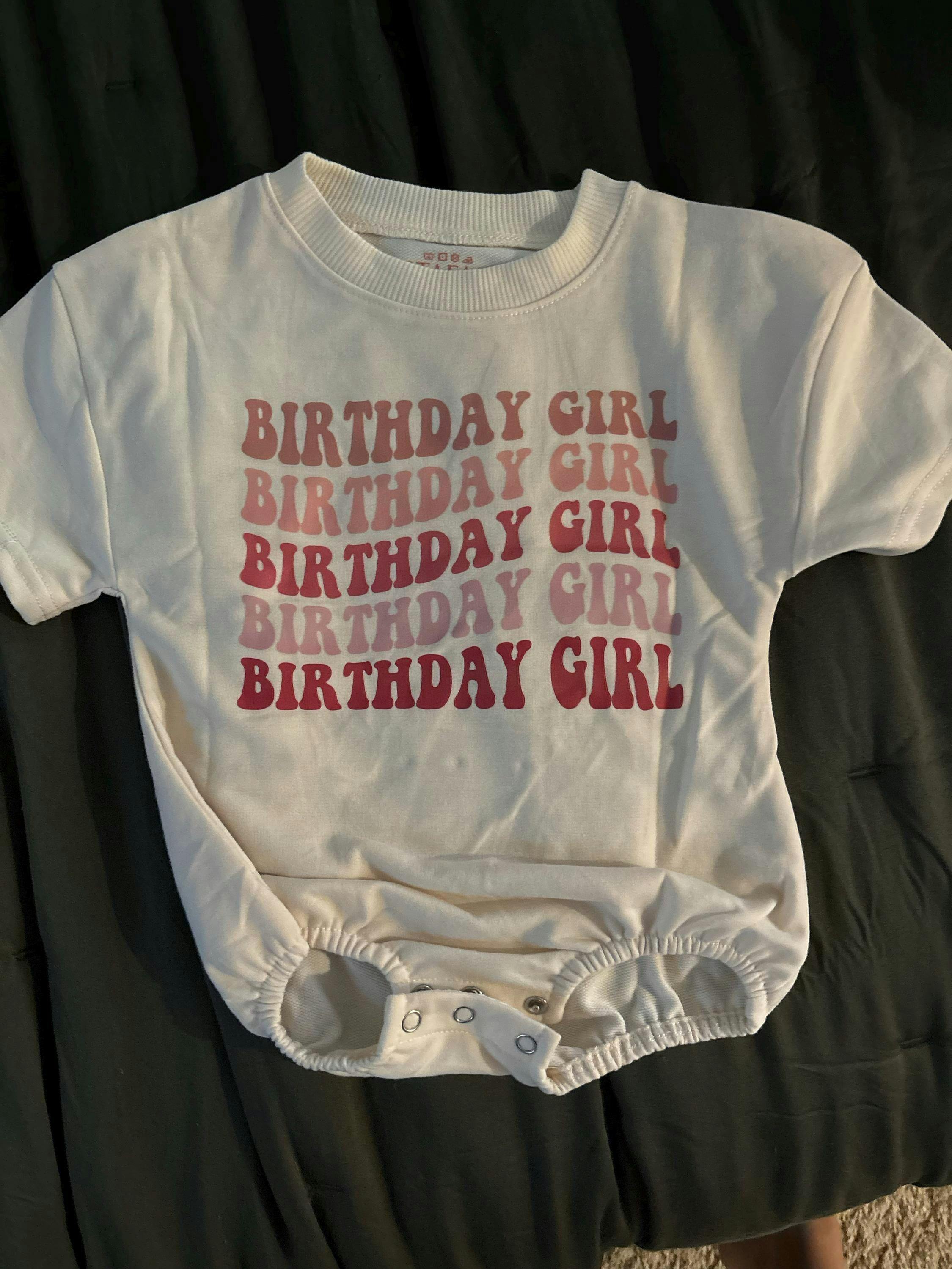 Celebrate her special milestone with an outfit as unique and joyful as she is, perfect for capturing those unforgettable first birthday memories. This adorable short-sleeve bubble romper features "BIRTHDAY GIRL" printed four times in a charming stacked pattern, designed with a bubbly, retro-inspired font. The text shimmers in varying shades of pink, creating a delightful gradient effect, with an option to personalize it further with her name, like "EMILY" on a bold '1', making it truly hers. Its simple yet playful aesthetic captures the sweet essence of childhood, ensuring she looks utterly delightful for her big day. Imagine her crawling, playing, and smiling in this soft, comfortable outfit, whether at her party, for cake smash photos, or just a precious family gathering. It’s more than just a piece of clothing; it's a cherished keepsake that embodies the love and excitement of her first year. Create picture-perfect moments and a lasting memory by choosing this uniquely personalized birthday outfit for your little one today.