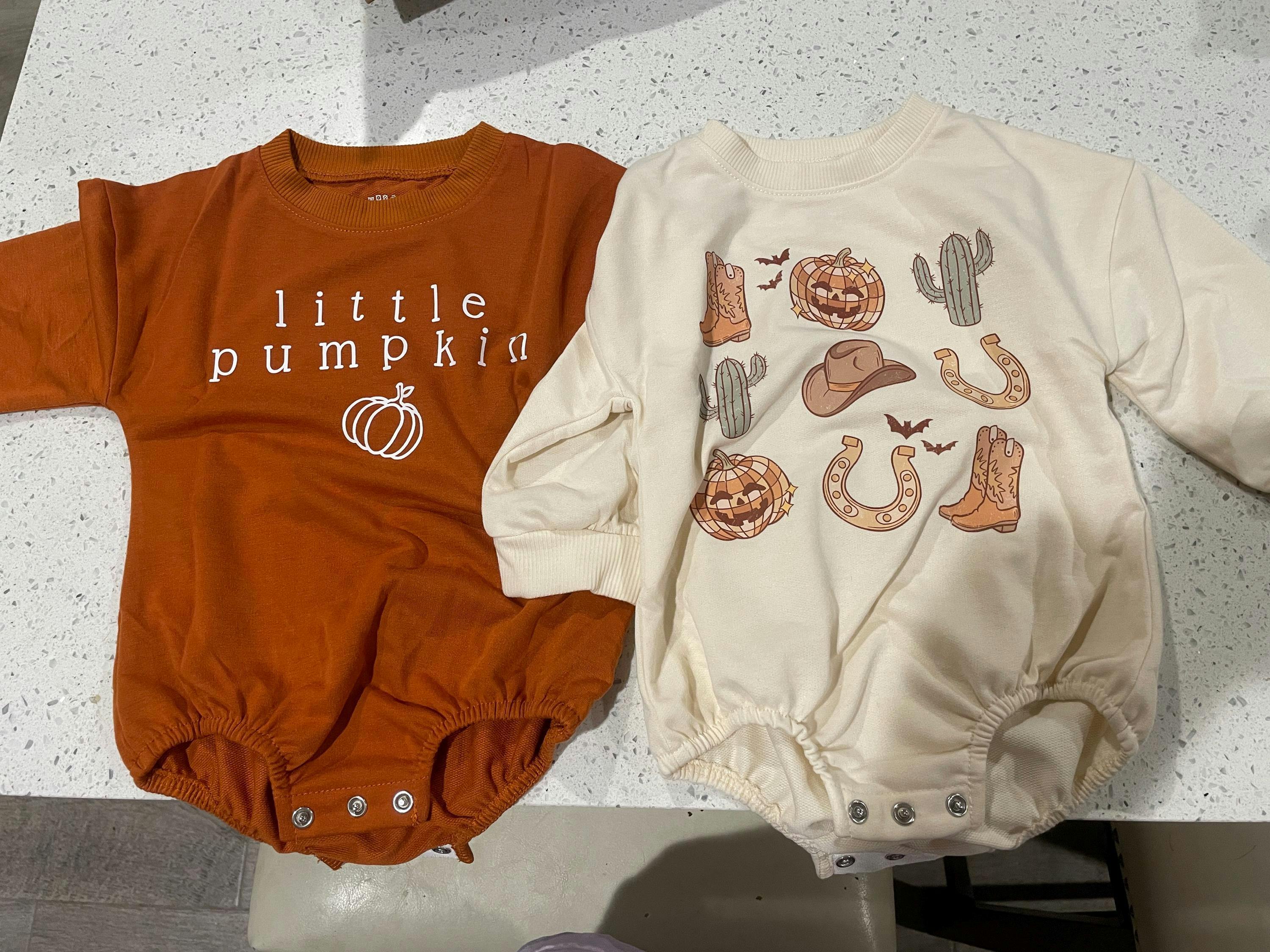 Saddle up for the cutest Halloween! This adorable romper combines the charm of the Wild West with the spooktacular fun of Halloween. Imagine your little one in this retro-inspired design, featuring cowboy boots, pumpkins, and bats in a muted, earthy palette. Perfect for that unforgettable first Halloween, this romper is sure to bring smiles and capture those precious memories. Get ready for lots of compliments and adorable photo ops!