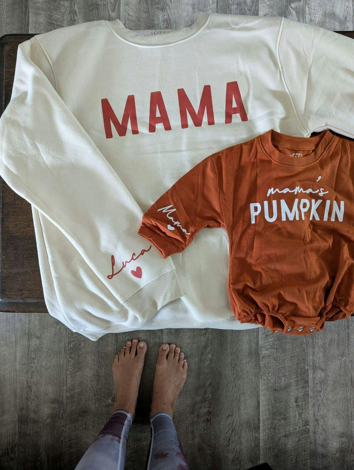 Celebrate the cozy season with our adorable Mama and Pumpkin matching set! Picture snuggly family moments in these outfits, perfect for autumn adventures. The off-white sweatshirt features 'MAMA' in bold, rust-colored letters, while the romper playfully declares 'mama's PUMPKIN' in charming white block letters. The sleeve details – 'Emily' with a heart on the sweatshirt and 'Mama' with a heart on the romper – add a special touch, creating lasting memories from pumpkin patches to holiday gatherings. Dress your little one in comfort and style, making this fall extra special.