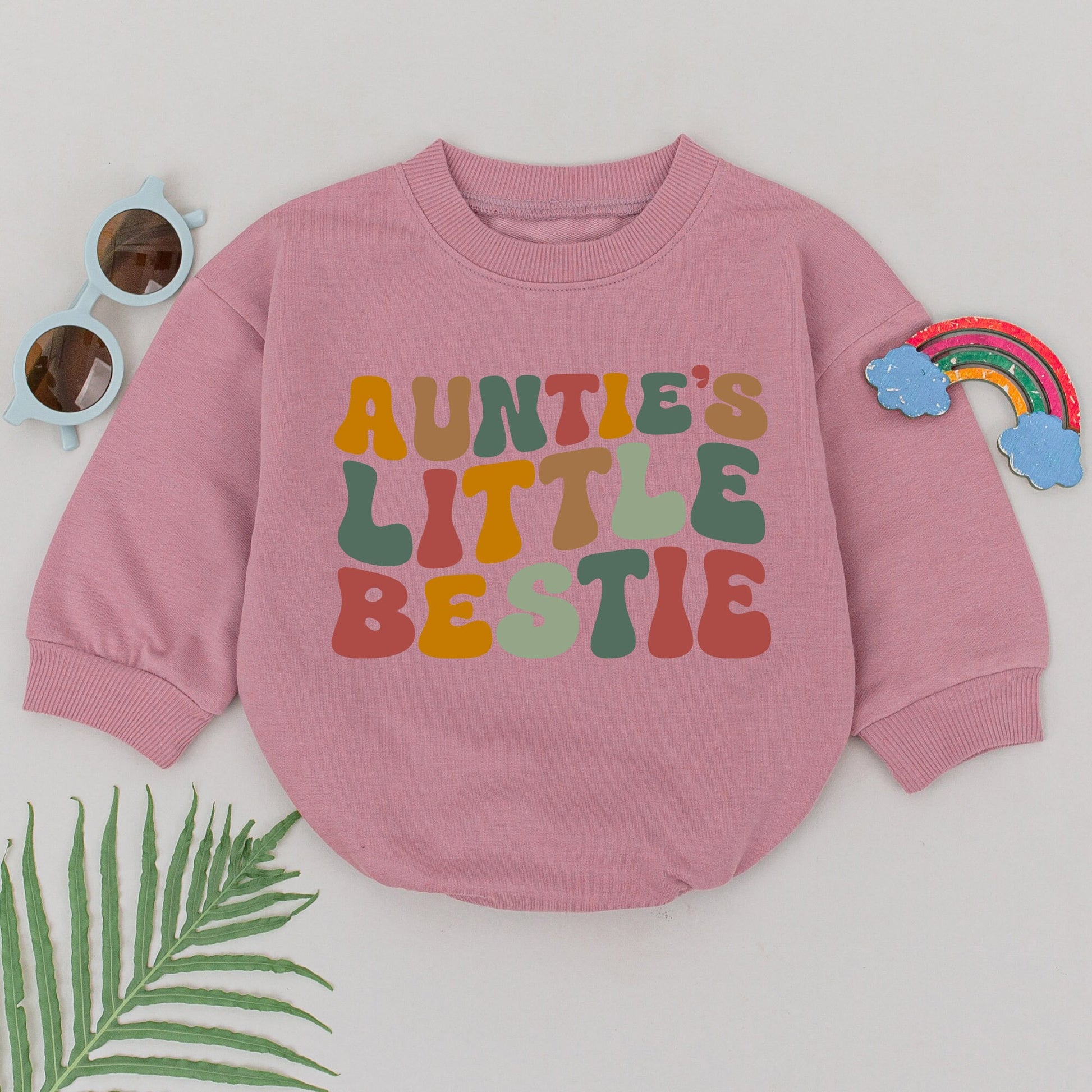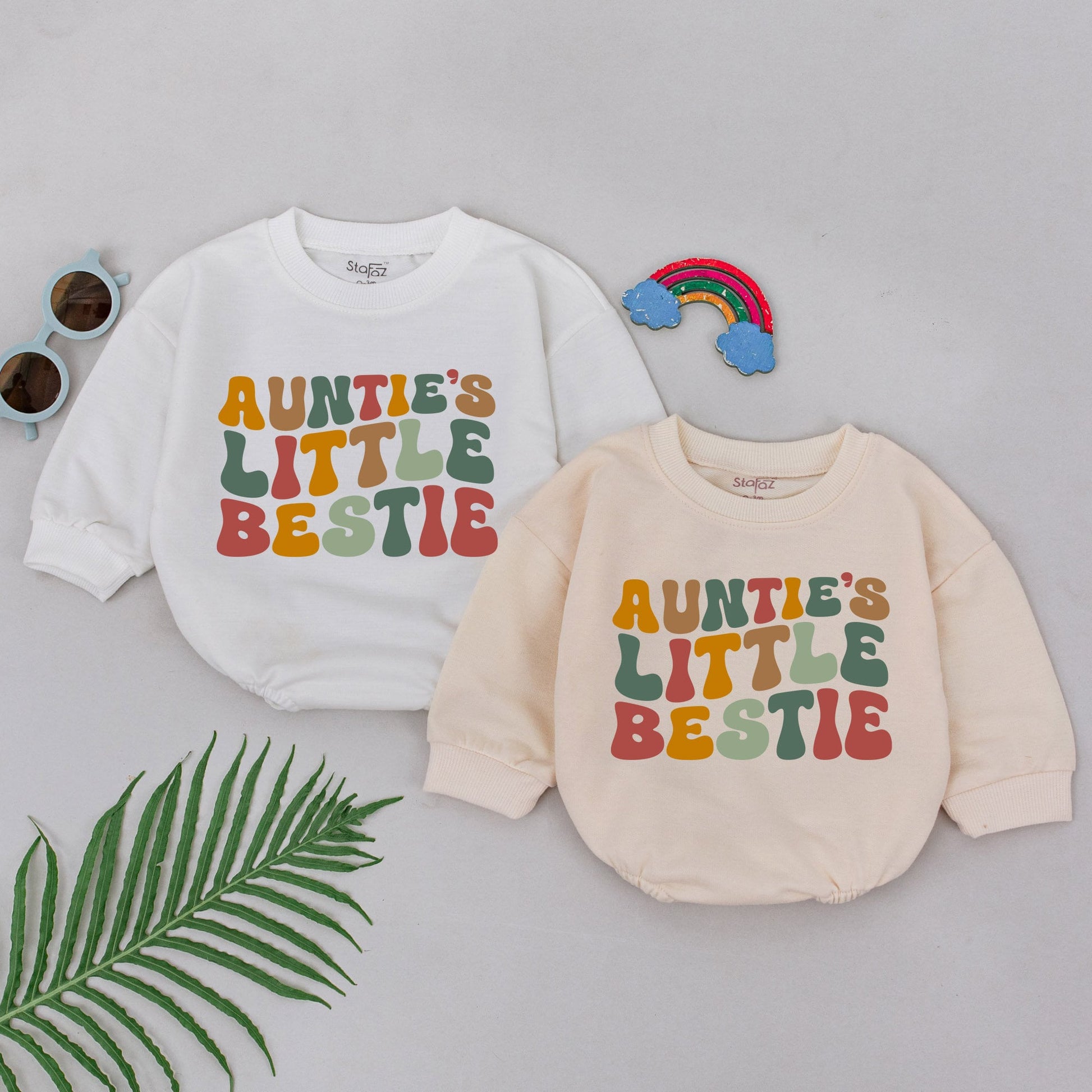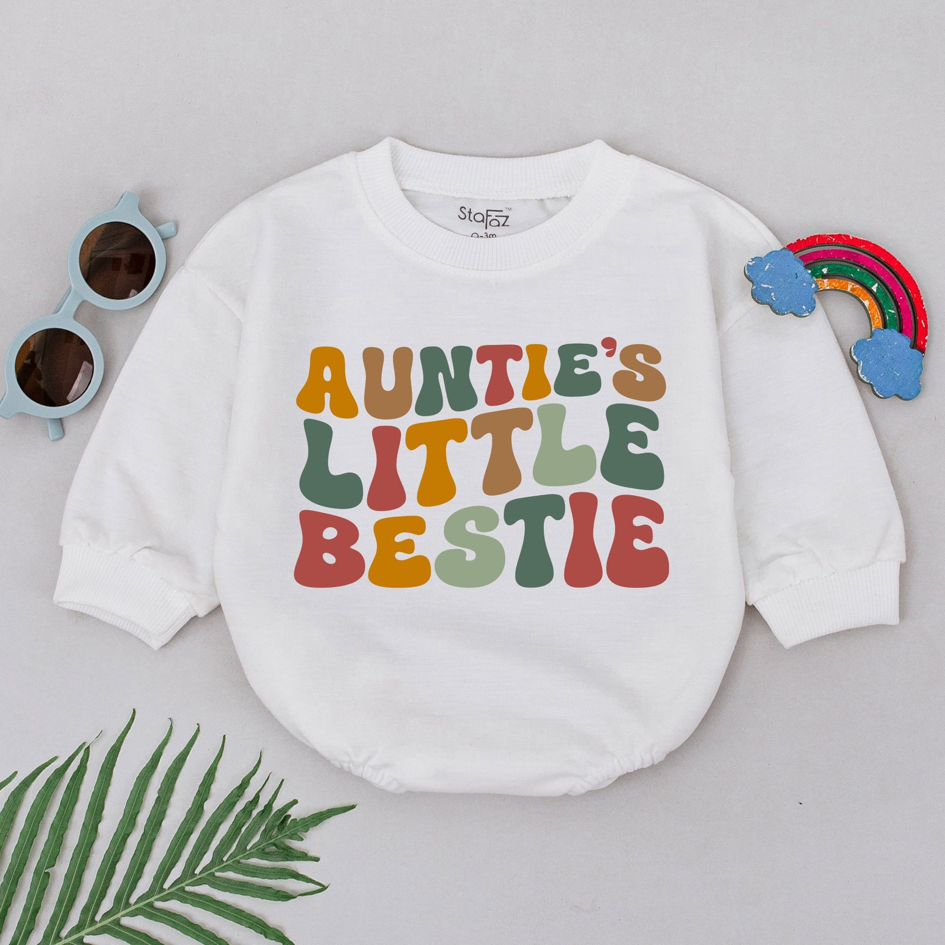 Retro Auntie's Little Bestie Romper Playful Baby Outfit Newborn Gift for New Auntie Mother's Day Shower Girls Boys Green Orange Brown Red