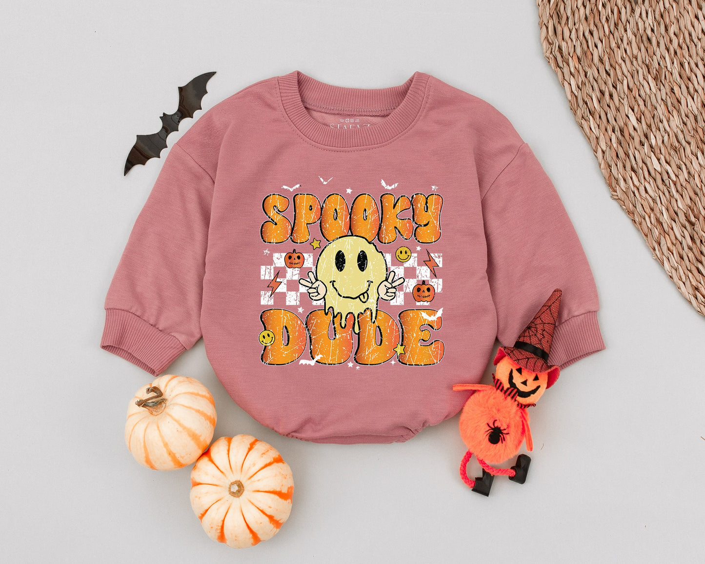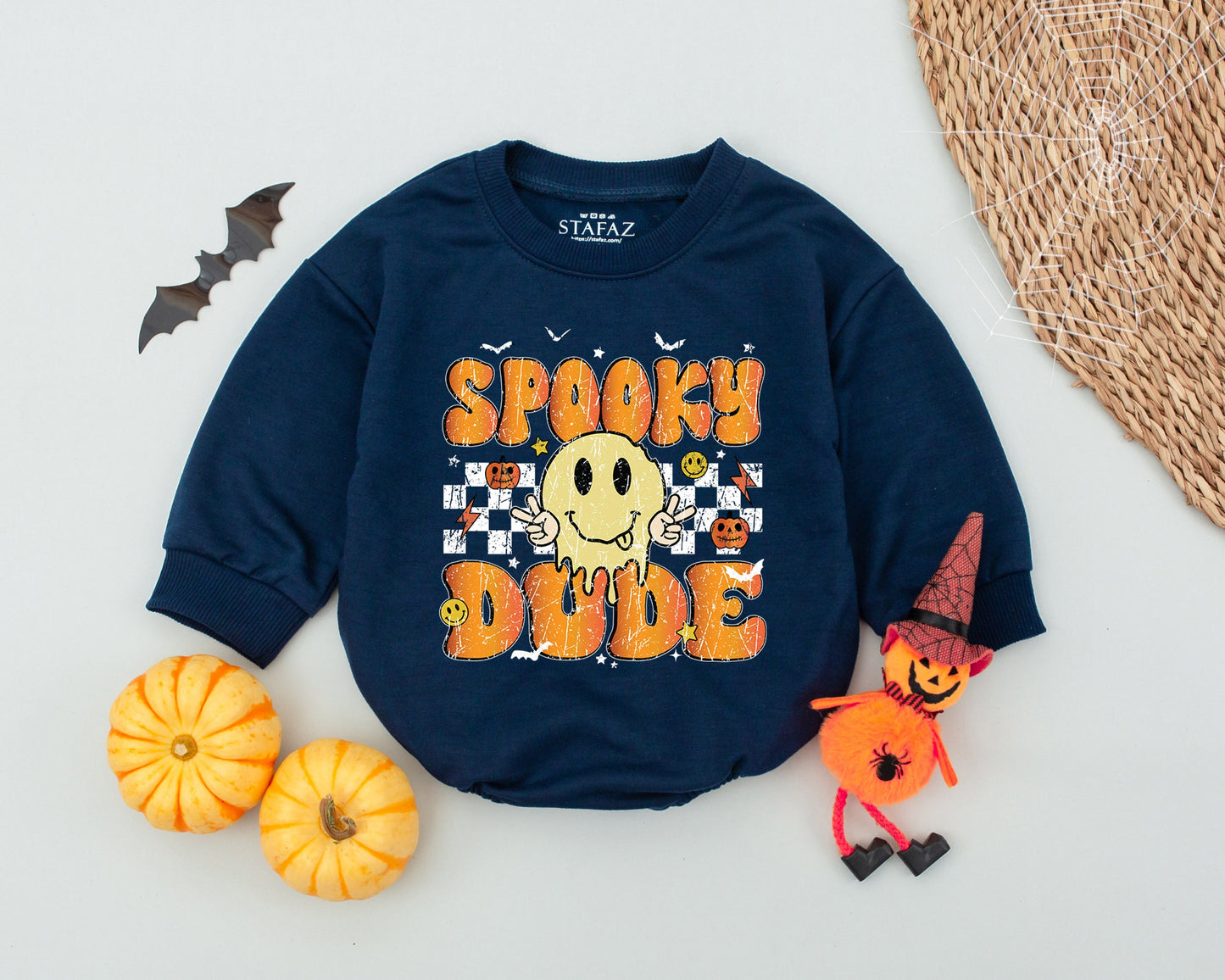 Get ready for a spooktacular Halloween with this adorable baby romper! Imagine your little dude rocking this vintage-inspired outfit at a Halloween party or while trick-or-treating. The design features "SPOOKY DUDE" in a retro font, surrounded by bats, pumpkins, and a dripping smiley face against a cool checkered backdrop. It's playful, comfy, and perfect for capturing those precious first Halloween memories. This soft and stylish romper is sure to be a hit this spooky season! A perfect outfit for Halloween photos and memories. Snag this unique outfit for your little one!