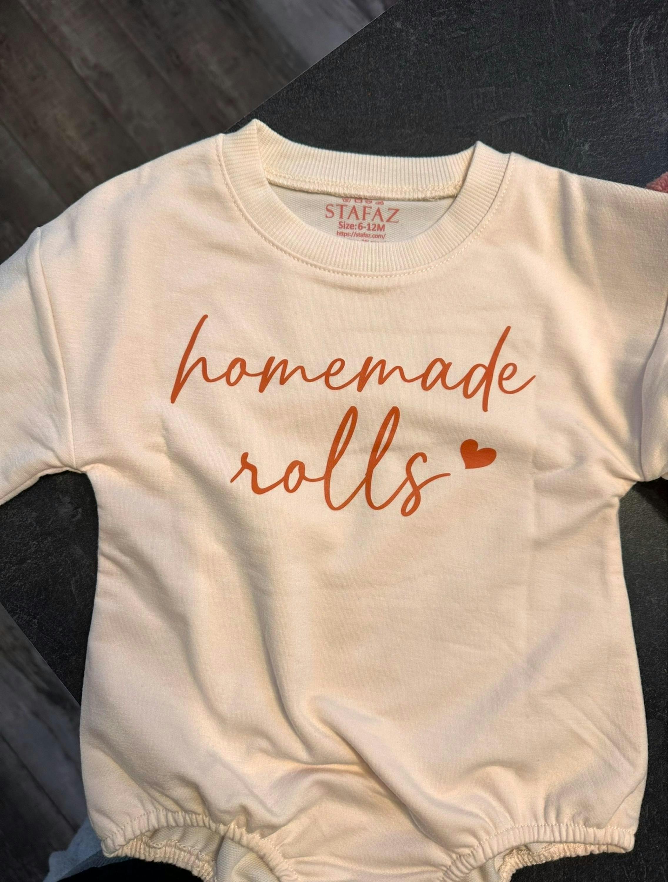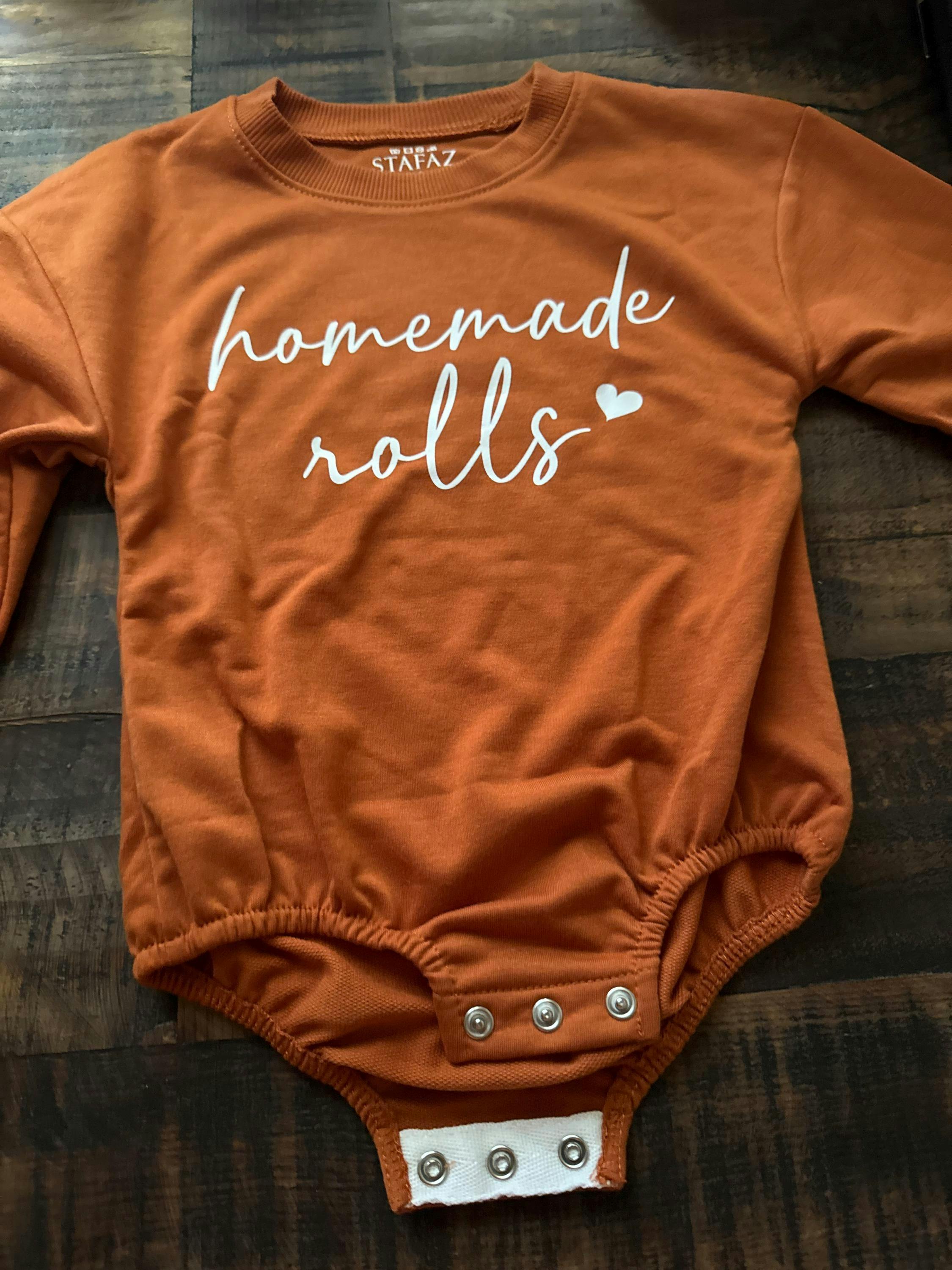 Cozy up this fall with our adorable 'Homemade Rolls' romper! The charming white cursive script and sweet little heart evoke a warm, nostalgic feeling. Imagine your little one snuggled in this cute outfit, ready for pumpkin patches or Thanksgiving Day fun. Perfect for baby's first Thanksgiving or as a thoughtful baby shower gift, this retro design adds a touch of sweetness to every moment.